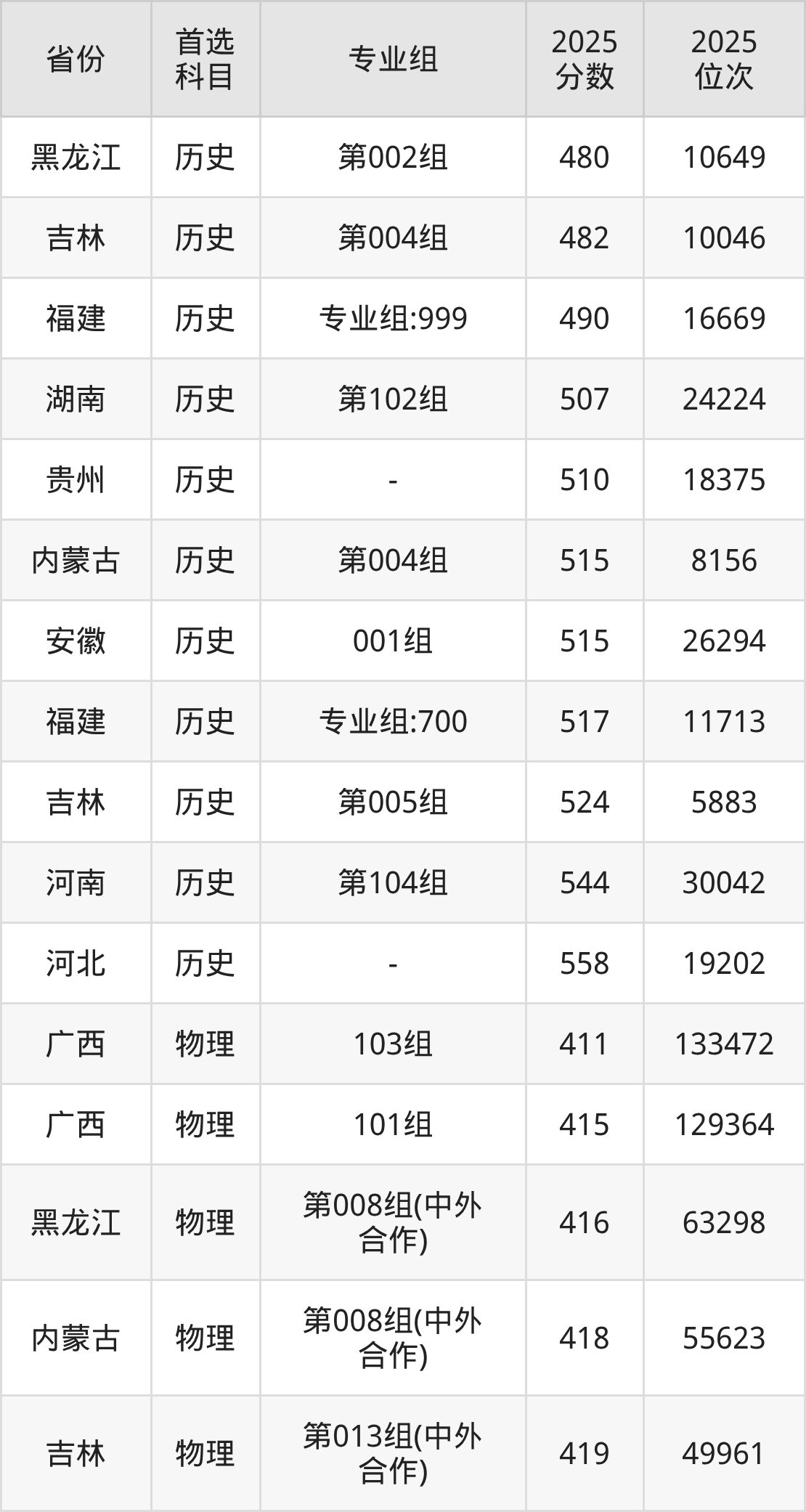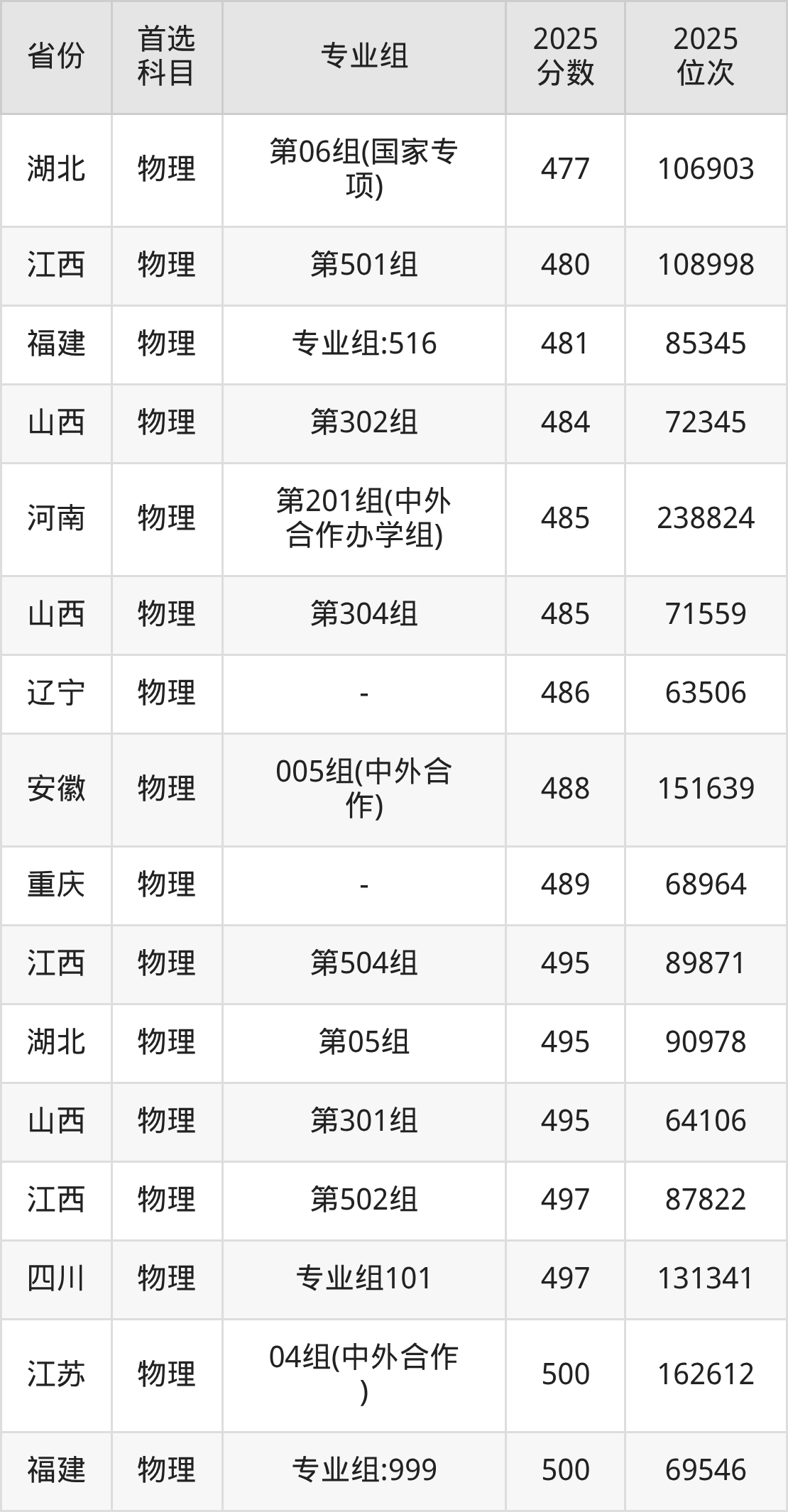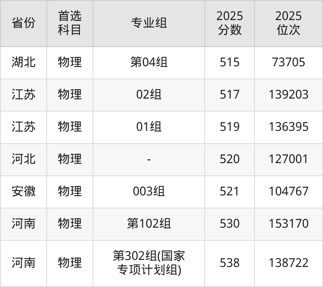 物理类:第001组477分、32699名,第001组488分、29674名,第008组442分、42516名,第009组443分、42231名,第010组(地方专项)449分、40428名,第011组448分、40737名,第012组433分、45058名,第013组(中外合作)411分、51502名,第014组(国家专项)429分、46212名;