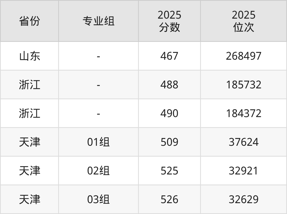 最低分对应地区为山东,录取位次为268497,超一段线79分;最高分对应地区为天津(03组),录取位次为32629。