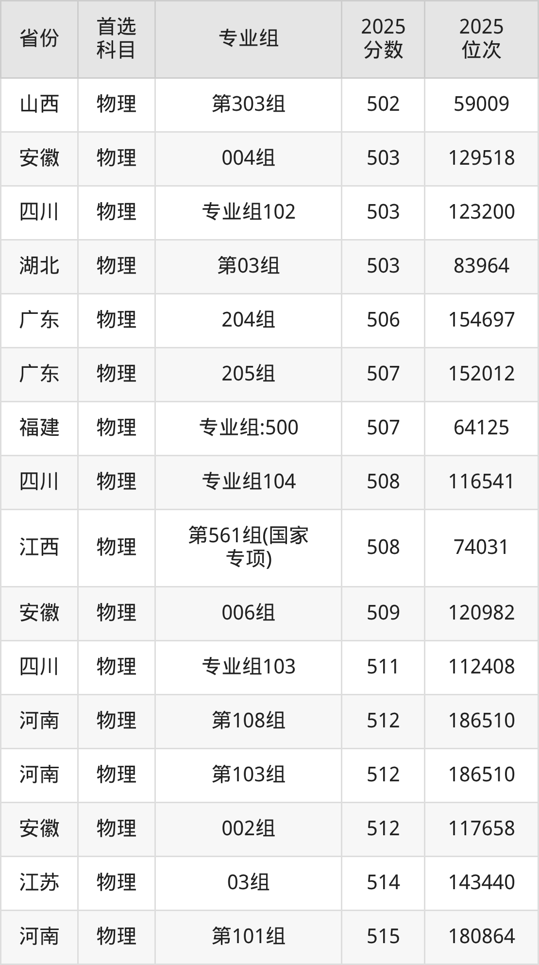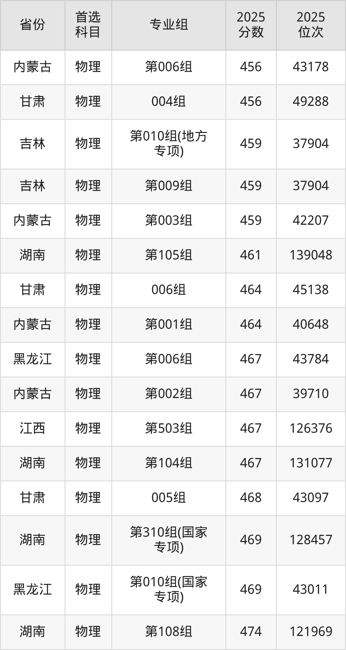 物理类:第008组440分、43673名,第009组459分、37904名,第010组(地方专项)459分、37904名,第011组454分、39384名,第012组440分、43673名,第013组(中外合作)419分、49961名,第014组(国家专项)454分、39384名;