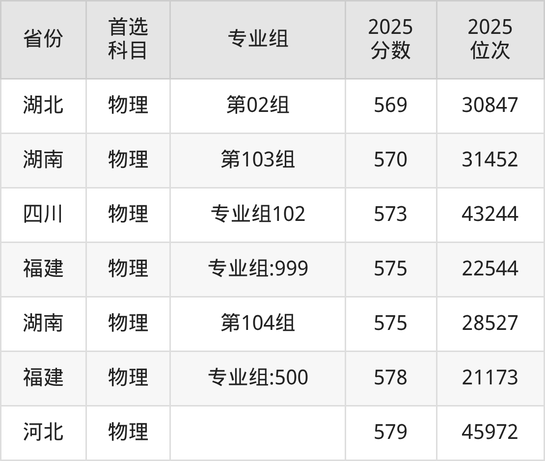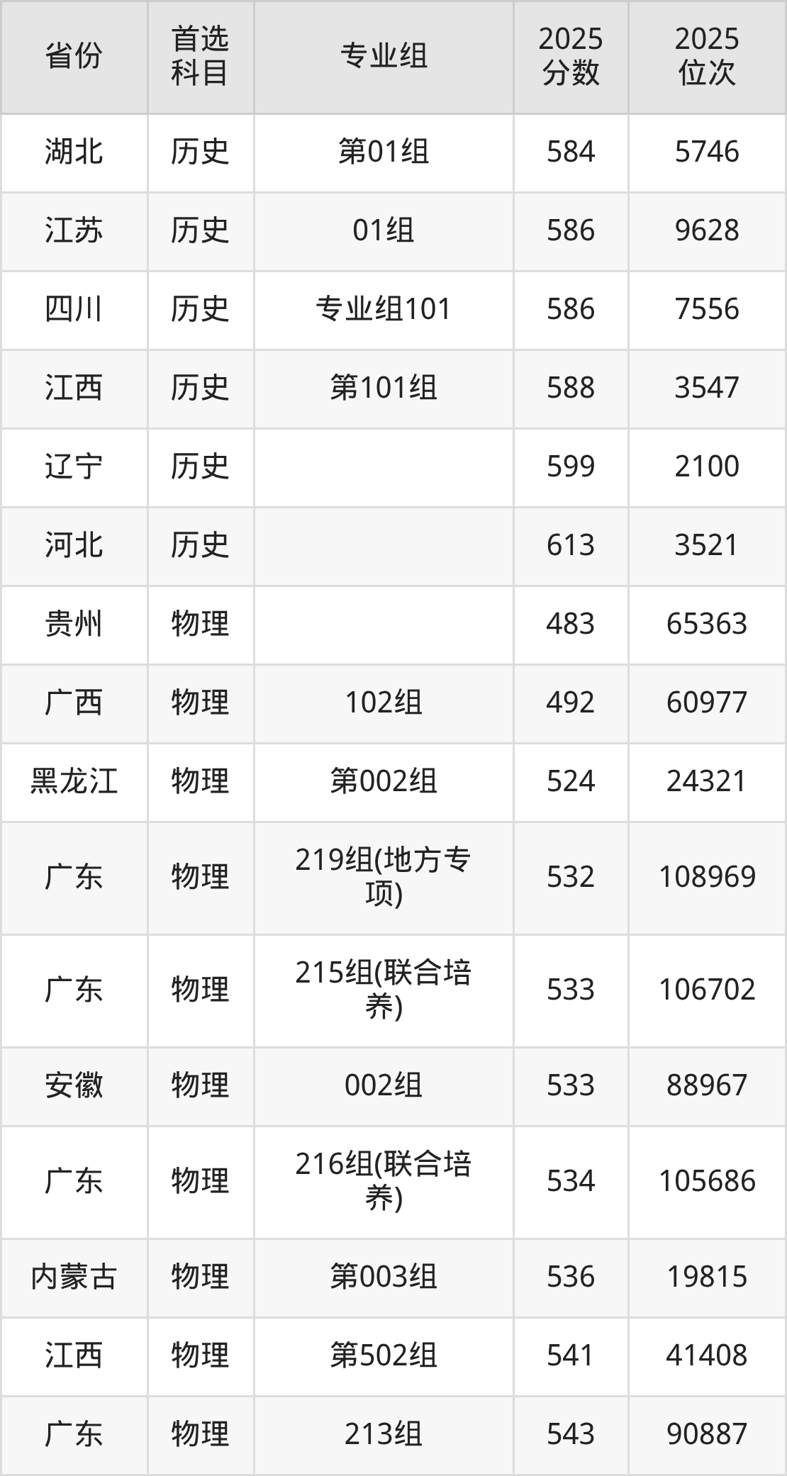 物理类:202组548分、84422名,204组544分、89870名,206组565分、60677名,208组549分、81883名,210组551分、80003名,211组556分、72264名,213组543分、90887名,215组(联合培养)533分、106702名,216组(联合培养)534分、105686名,219组(地方专项)532分、108969名,220组(地方专项)554分、74811名;