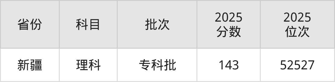 理科最低分对应地区为新疆,录取位次为52527,超专科线3分。