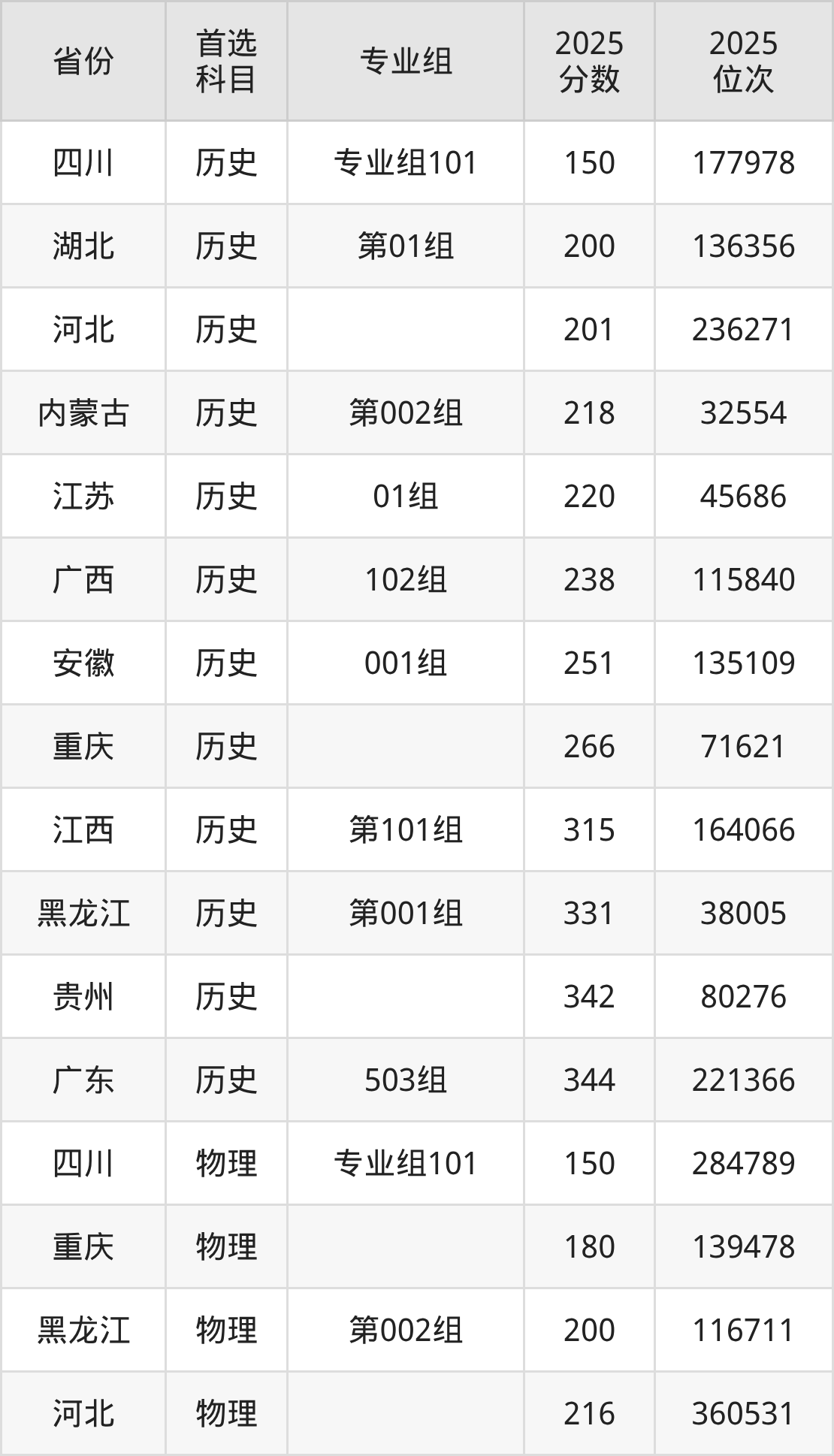 历史类最低分对应地区为四川(专业组101),录取位次为177978;最高分对应地区为广东(503组),录取位次为221366,超专科线129分。