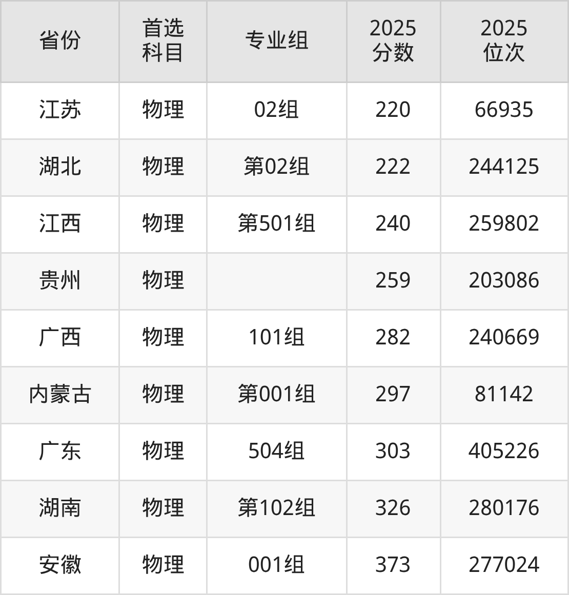 物理类最低分对应地区为四川(专业组101),录取位次为284789;最高分对应地区为安徽(001组),录取位次为277024,超专科线173分。
