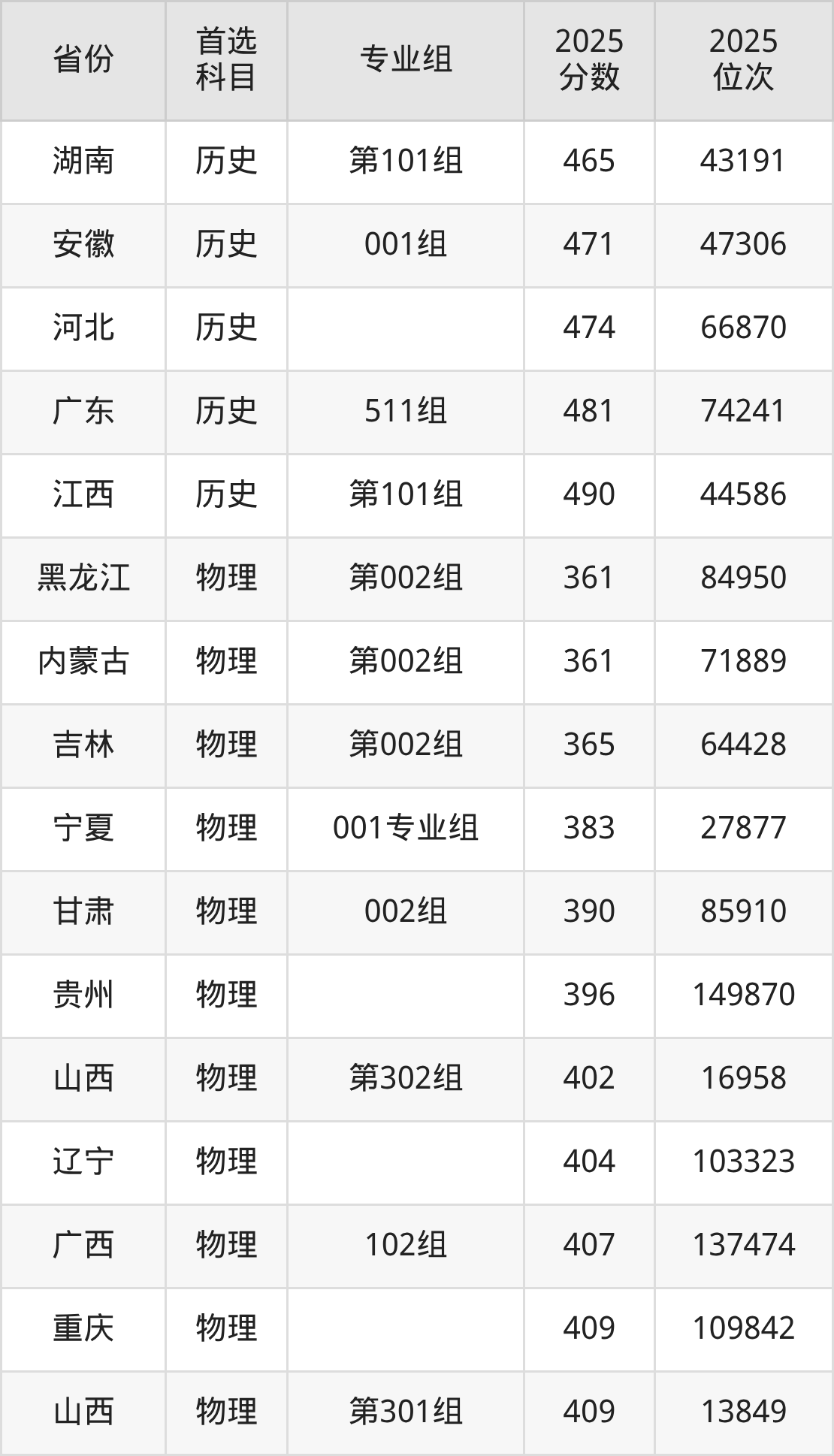 历史类最低分对应地区为黑龙江(第001组),录取位次为24069,超专科线239分;最高分对应地区为江西(第101组),录取位次为44586。