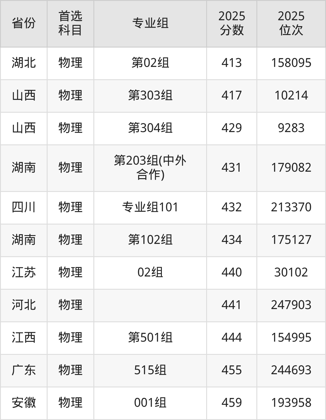 物理类:第102组427分、183616名,第203组(中外合作)417分、196120名;