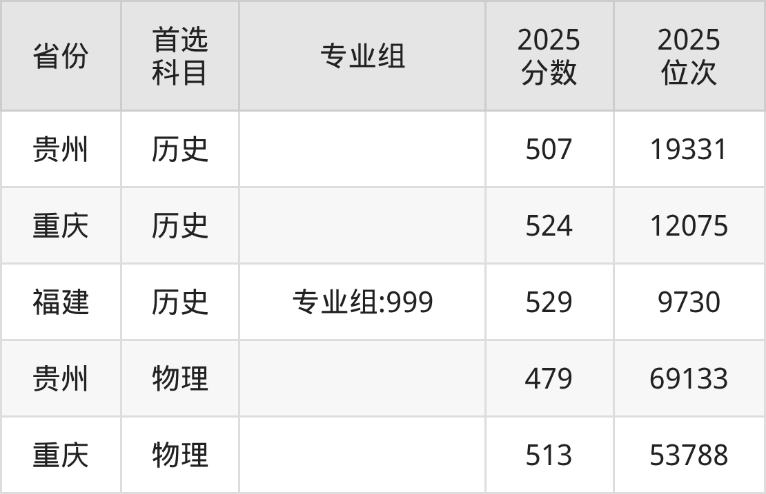 历史类最低分对应地区为贵州,录取位次为19331,超本科线49分;最高分对应地区为福建(专业组:999),录取位次为9730,超本科线79分。