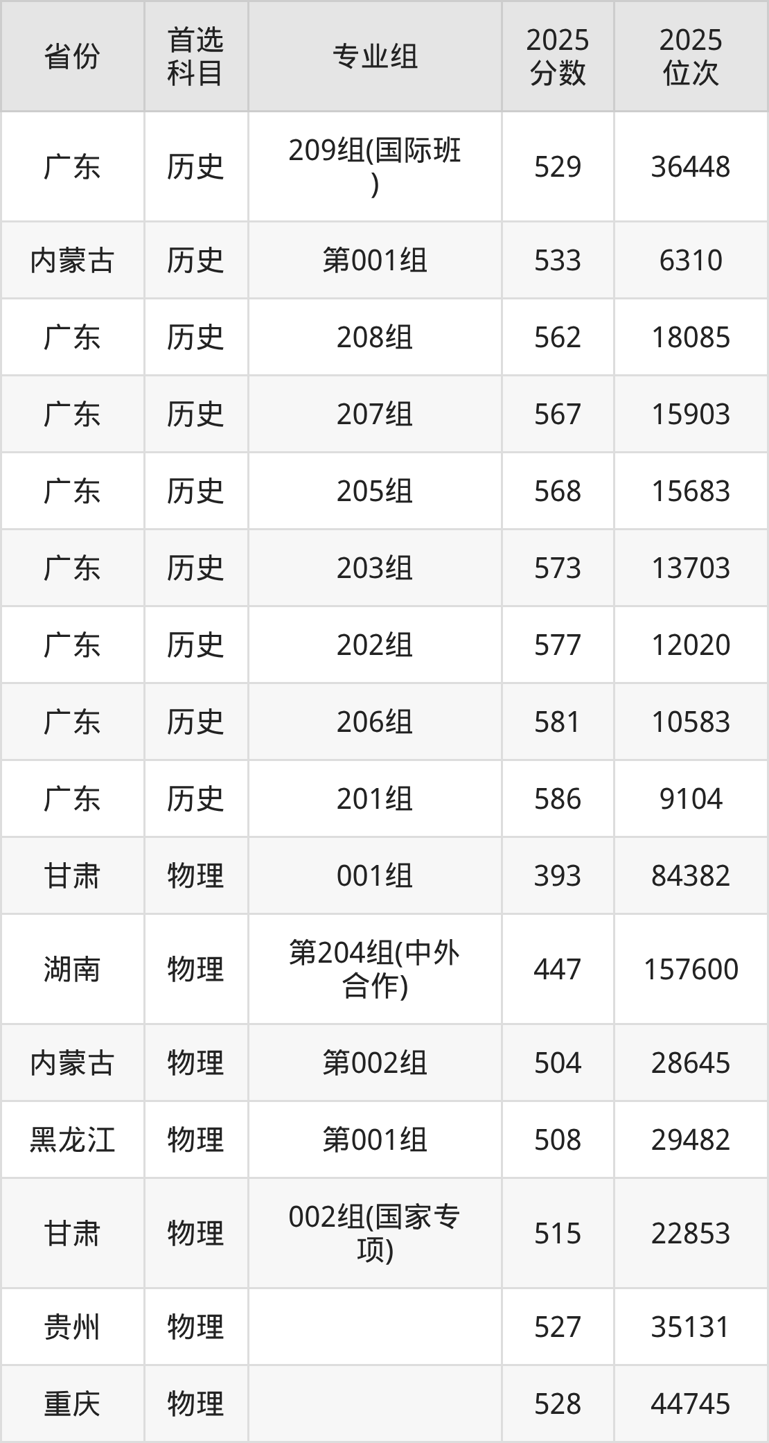 历史类最低分对应地区为广东(209组(国际班)),录取位次为36448,超本科线65分;最高分对应地区为广东(201组),录取位次为9104,超本科线122分。