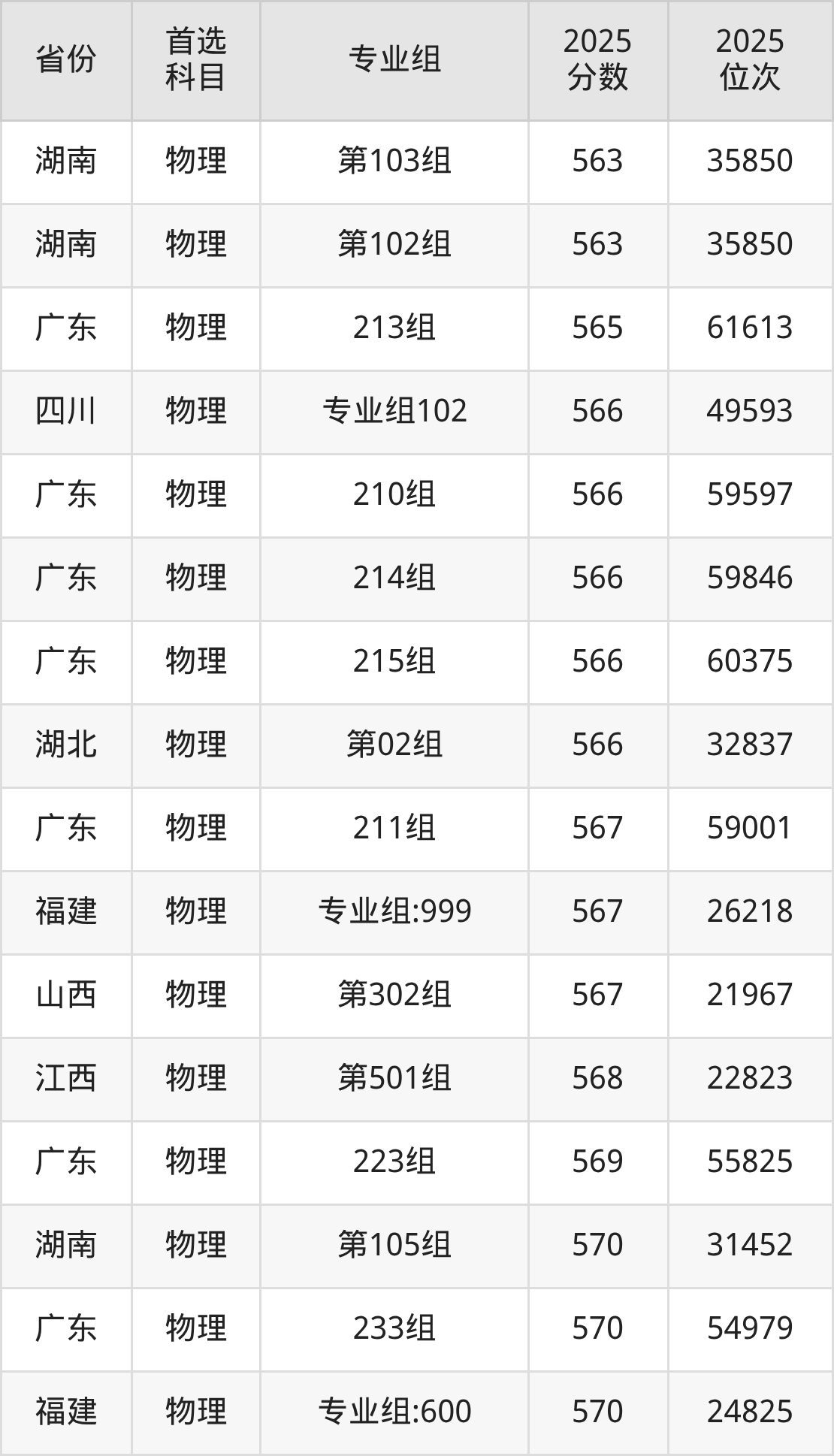 物理类:210组566分、59597名,211组567分、59001名,213组565分、61613名,214组566分、59846名,215组566分、60375名,216组583分、41496名,217组577分、47222名,218组589分、35806名,219组586分、38309名,220组574分、50998名,221组575分、49648名,222组573分、51860名,223组569分、55825名,230组593分、32245名,231组571分、53856名,232组572分、52750名,233组570分、54979名,251组(国际班)544分、89623名,252组(国际班)537分、99957名,253组(中外合作)543分、91803名,271组(地方专项)534分、105326名;