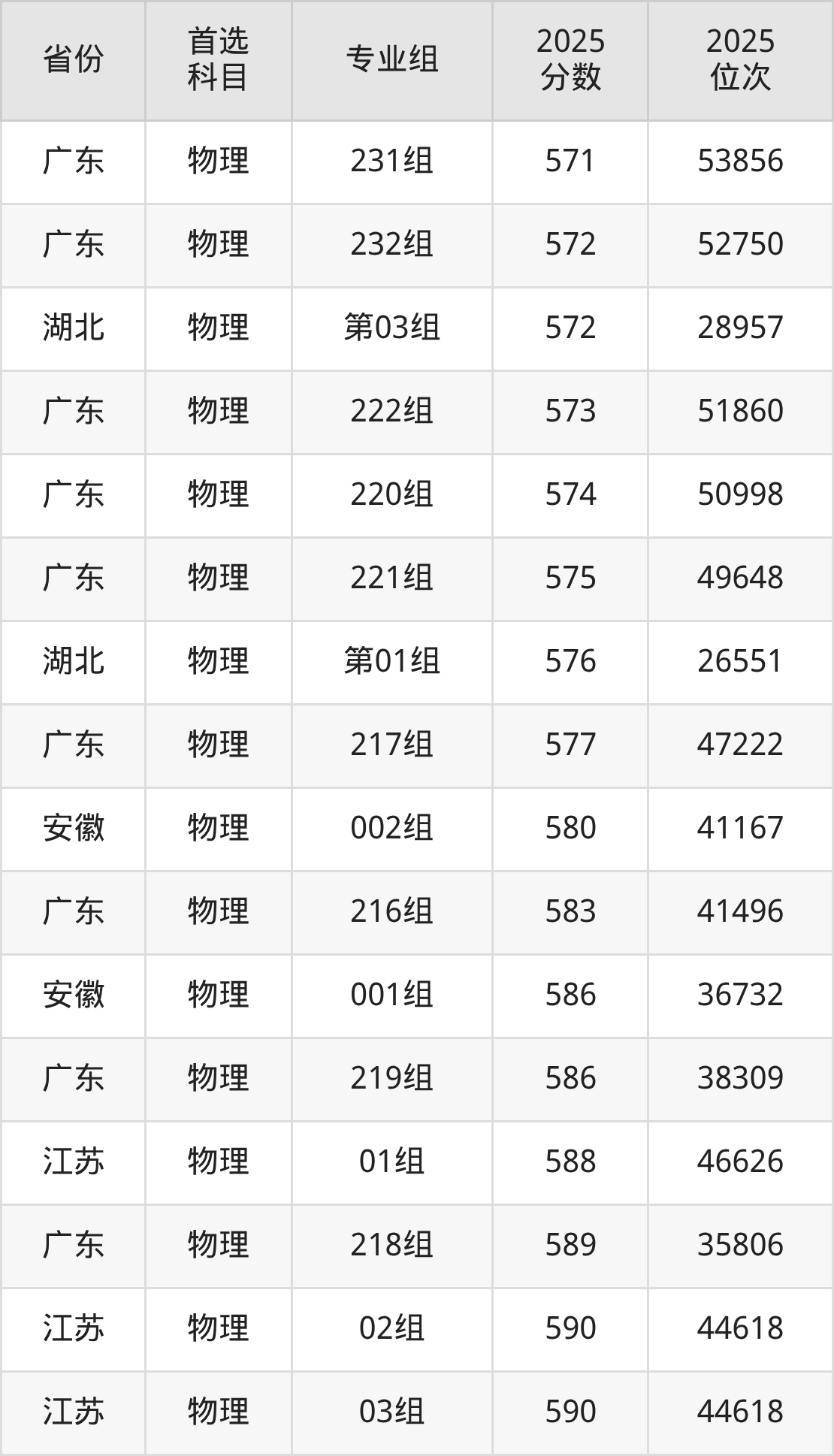 物理类:191组577分、46324名,210组586分、38271名,212组582分、41834名,213组580分、43608名,214组563分、60462名,216组584分、40023名,218组593分、32445名,219组589分、35719名,220组598分、28644名,221组579分、44460名,230组589分、35719名,231组583分、40917名,232组576分、47335名,251组(国际班)550分、75240名,252组(中外合作)558分、66000名,253组(中外合作)551分、74088名,271组(地方专项)540分、87514名,272组(地方专项)541分、86296名。