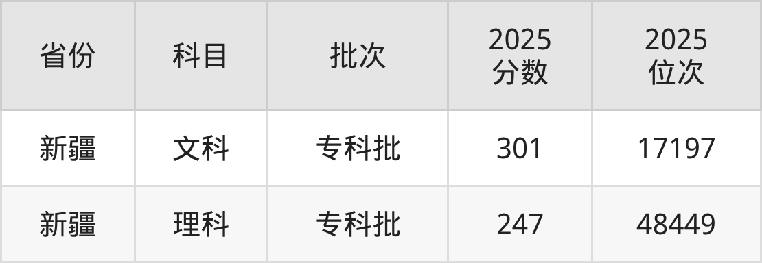 文科最低分对应地区为新疆,录取位次为17197,超专科线161分。