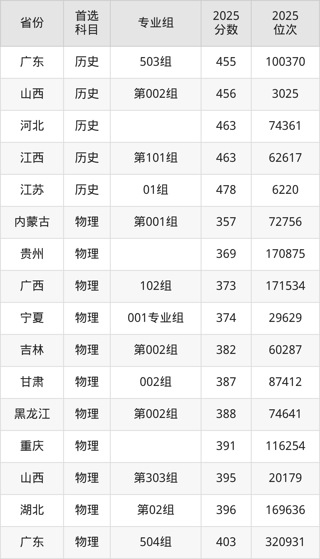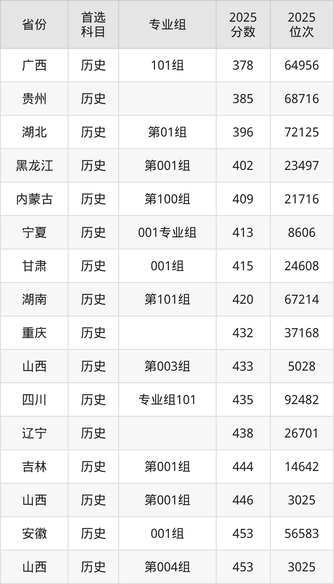 历史类最低分对应地区为广西(101组),录取位次为64956,超专科线178分;最高分对应地区为江苏(01组),录取位次为6220,超专科线258分。