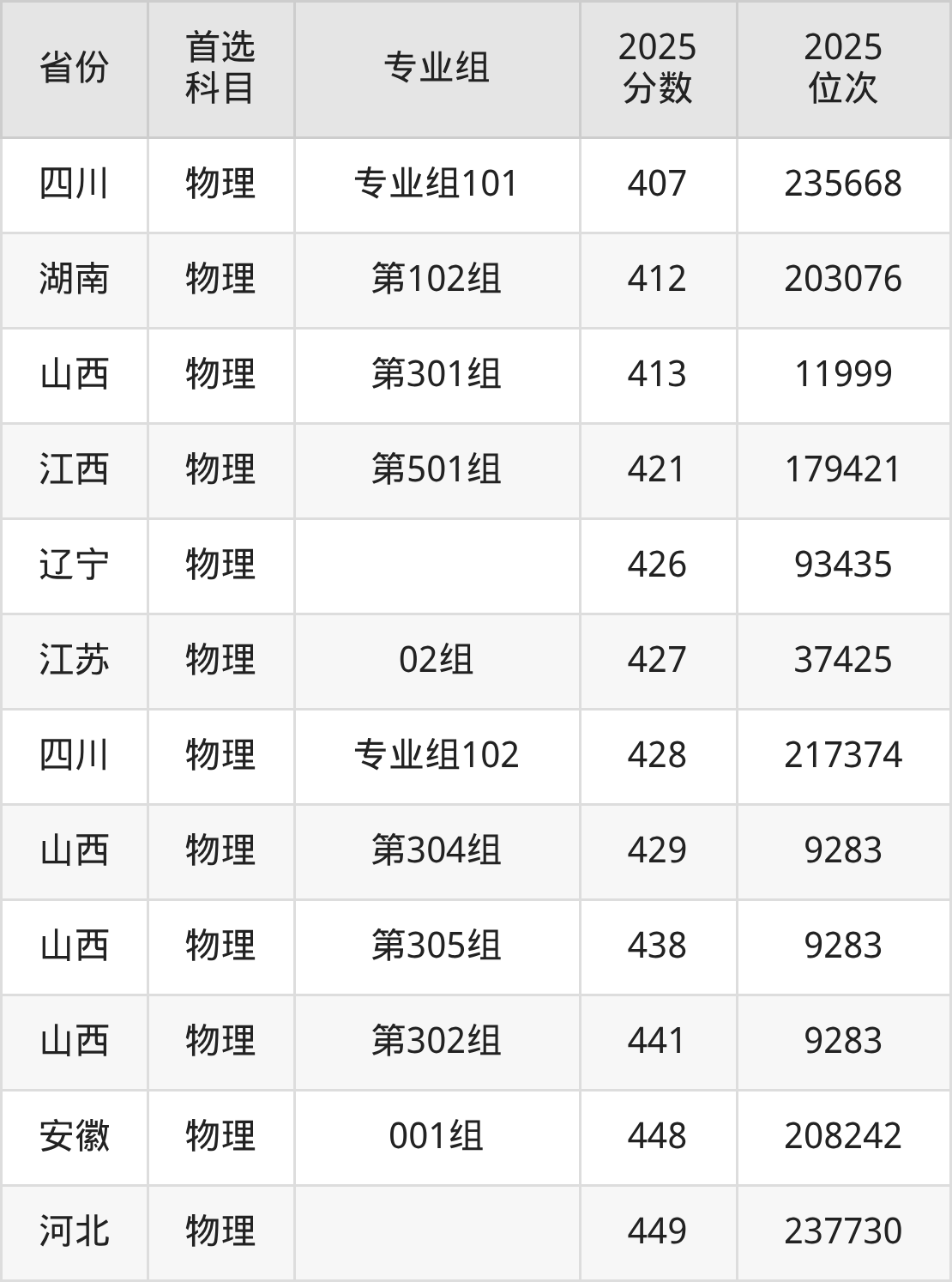 物理类最低分对应地区为内蒙古(第001组),录取位次为72756,超专科线197分;最高分对应地区为河北,录取位次为237730,超专科线249分。