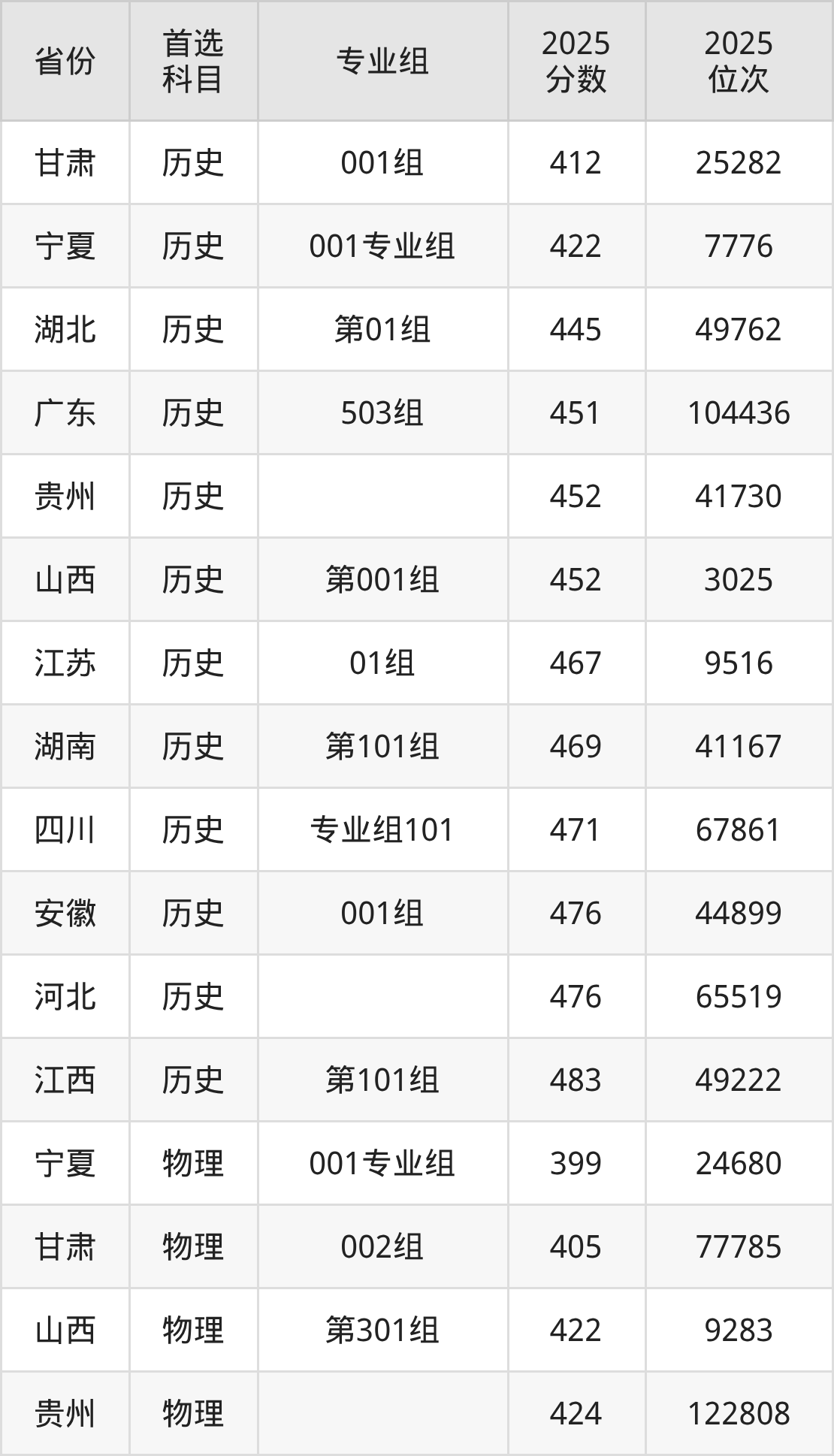 历史类最低分对应地区为甘肃(001组),录取位次为25282,超专科线252分;最高分对应地区为江西(第101组),录取位次为49222,超专科线193分。