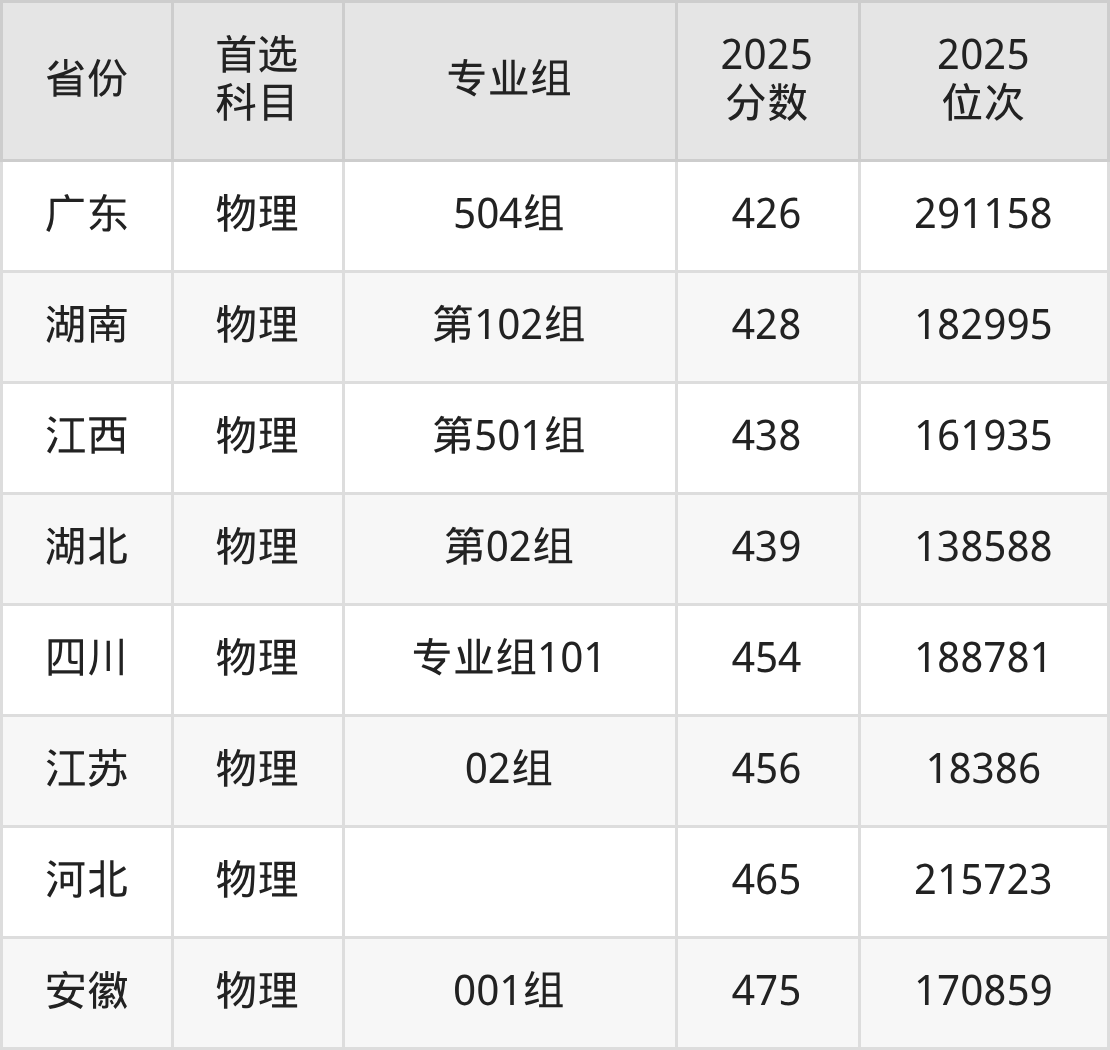 物理类最低分对应地区为宁夏(001专业组),录取位次为24680,超专科线249分;最高分对应地区为安徽(001组),录取位次为170859,超专科线275分。