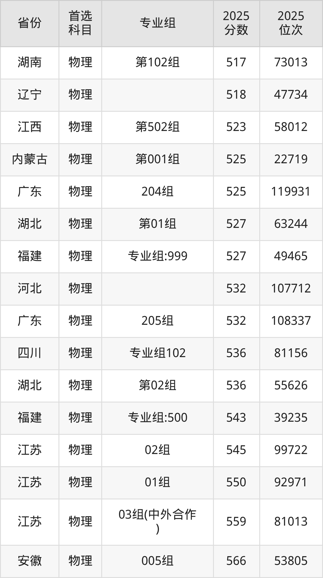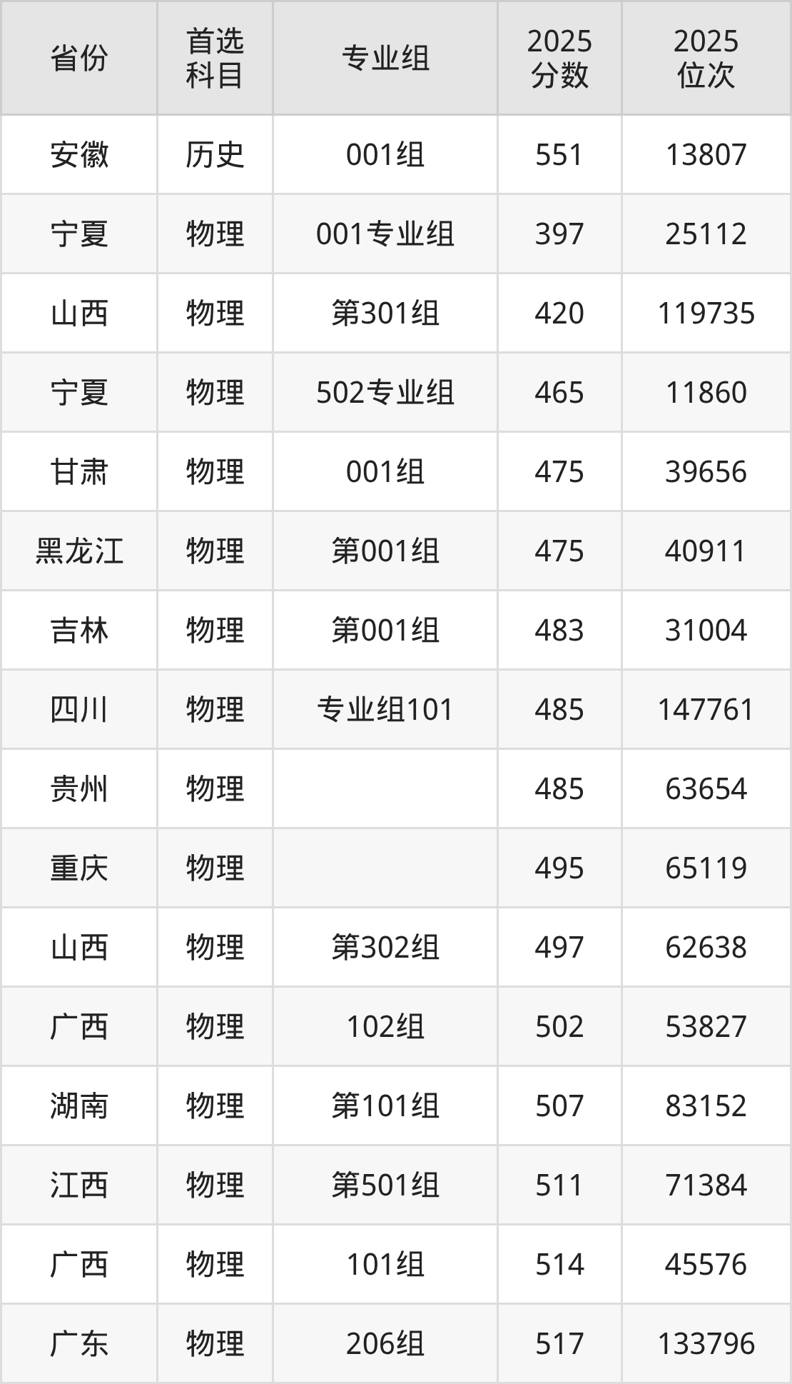 物理类最低分对应地区为宁夏(001专业组),录取位次为25112,超本科B25分;最高分对应地区为安徽(006组),录取位次为48862。