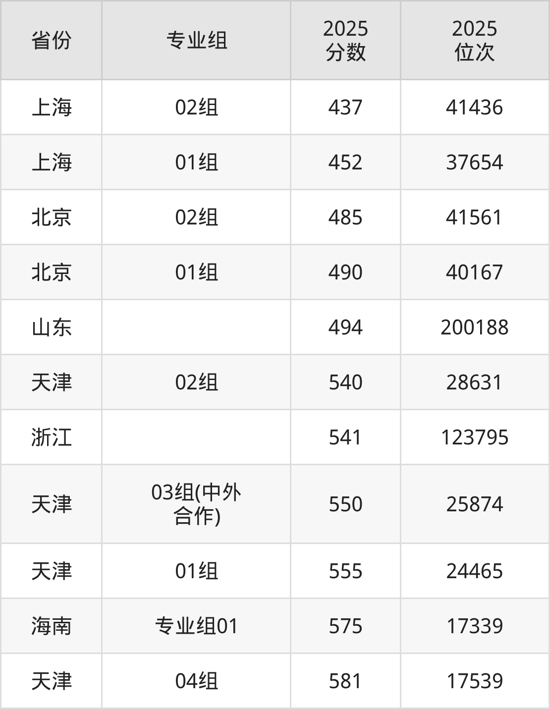 最低分对应地区为上海(02组),录取位次为41436,超本科线35分;最高分对应地区为天津(04组),录取位次为17539,超本科线105分。