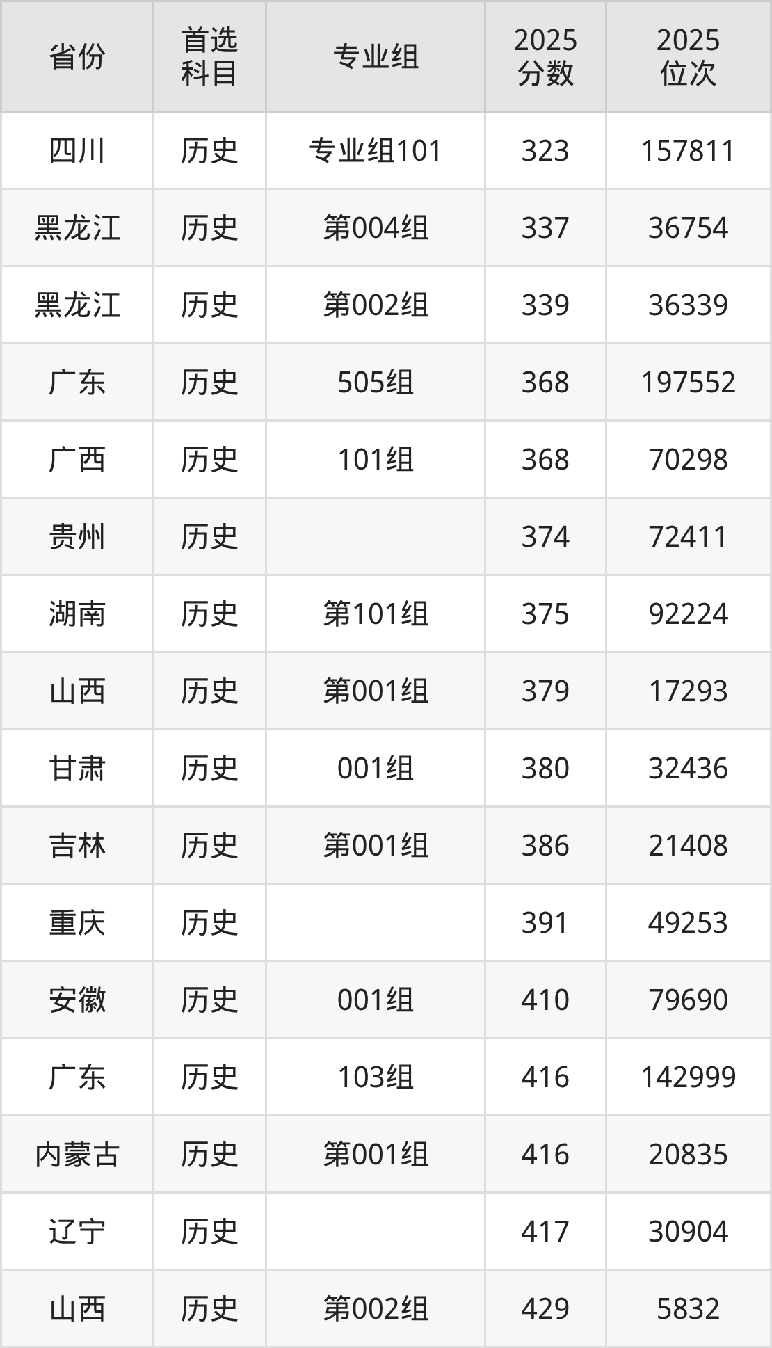 历史类最低分对应地区为四川(专业组101),录取位次为157811,超专科线173分;最高分对应地区为江西(第101组),录取位次为72277,超专科线158分。