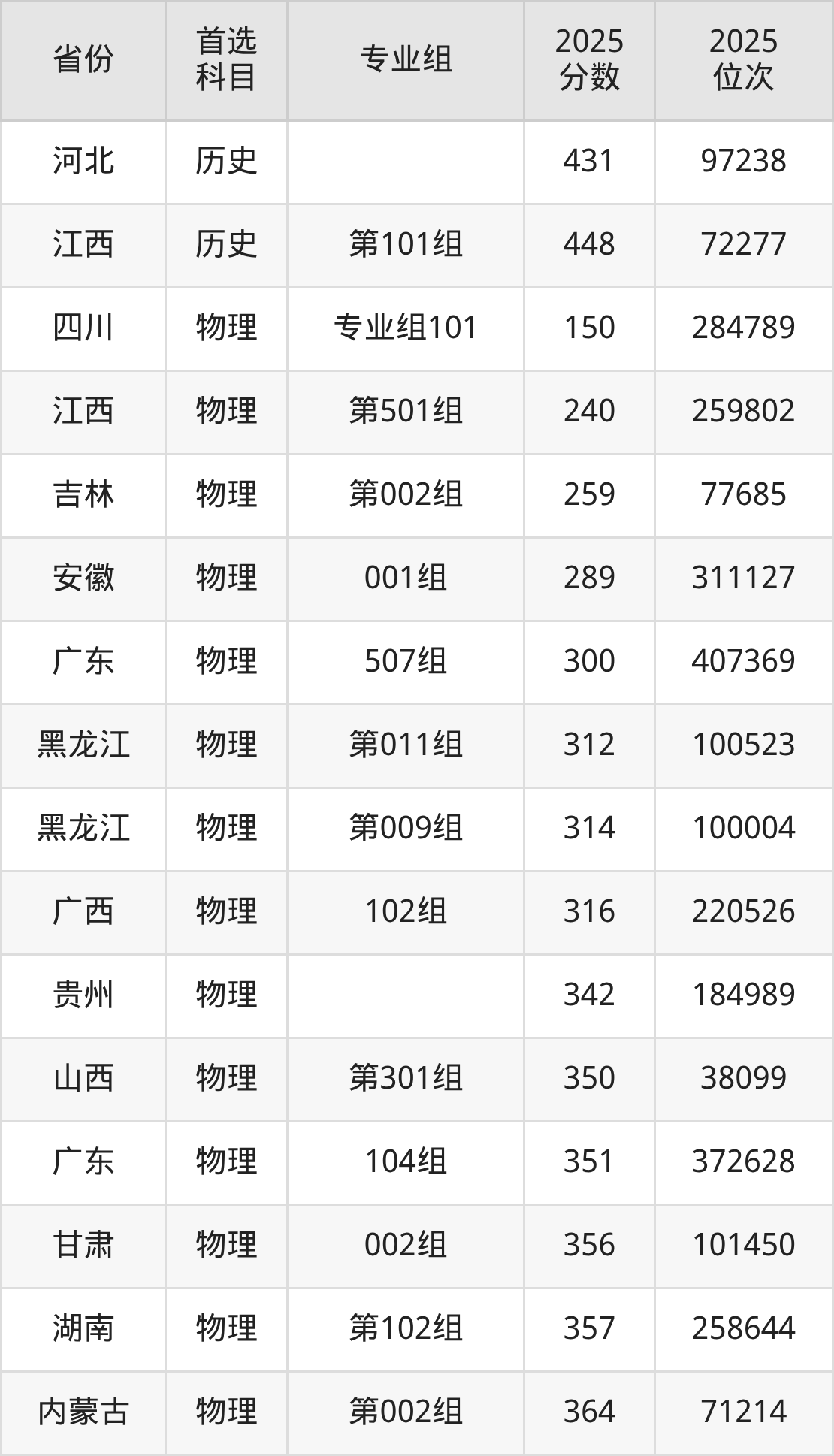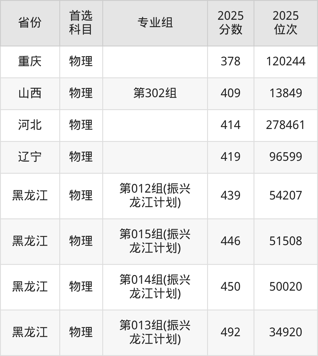 物理类:第008组331分、97406名,第009组(中外合作)342分、93524名,第010组346分、92065名,第011组(振兴龙江计划)422分、62591名;