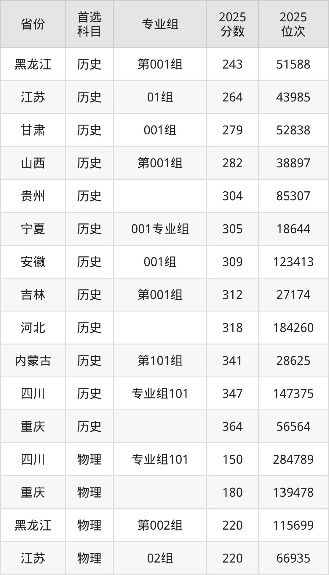 历史类最低分对应地区为黑龙江(第001组),录取位次为51588,超专科线83分;最高分对应地区为重庆,录取位次为56564,超专科线184分。