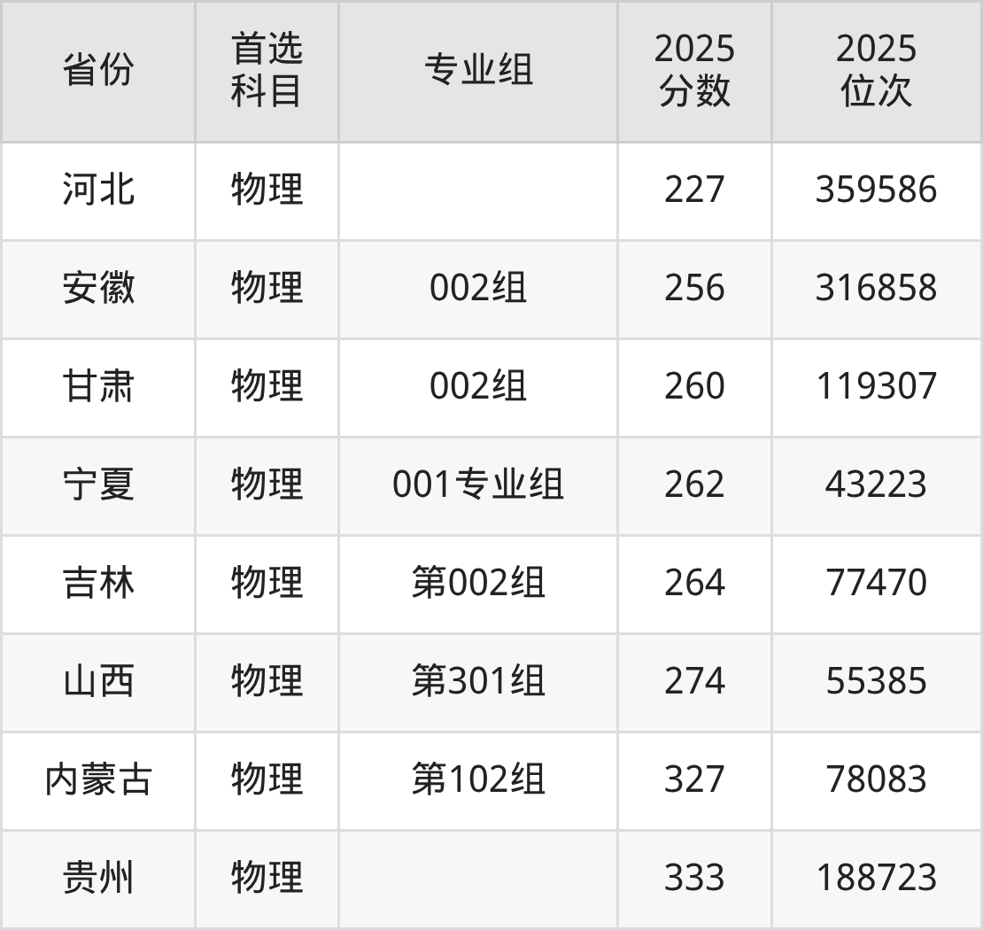 物理类最低分对应地区为四川(专业组101),录取位次为284789;最高分对应地区为贵州,录取位次为188723,超专科线153分。