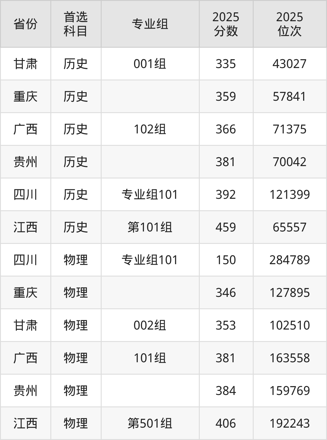 历史类最低分对应地区为甘肃(001组),录取位次为43027,超专科线175分;最高分对应地区为江西(第101组),录取位次为65557,超专科线169分。