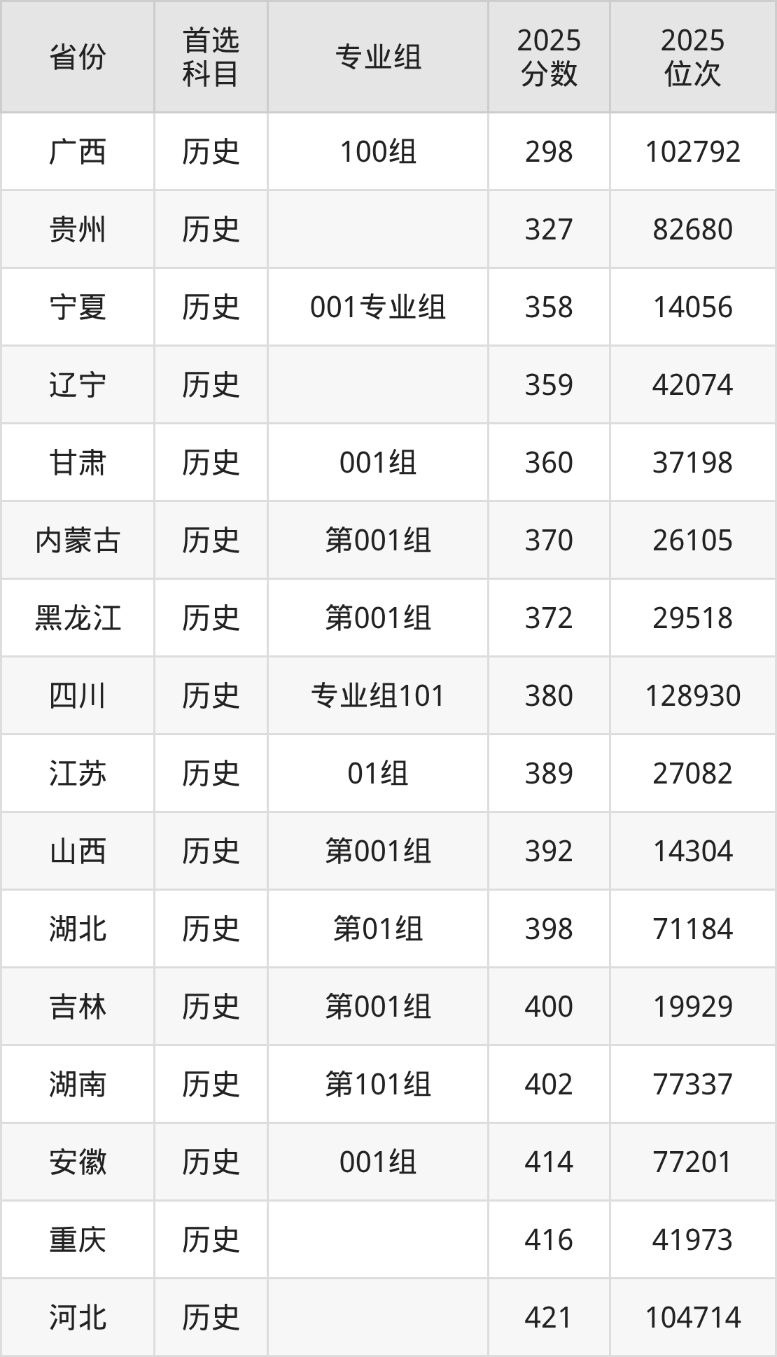 历史类最低分对应地区为广西(100组),录取位次为102792,超专科线98分;最高分对应地区为江西(第101组),录取位次为62211,超专科线174分。