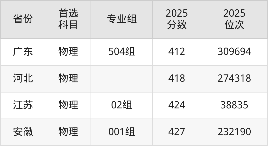 物理类最低分对应地区为内蒙古(第002组),录取位次为80975,超专科线139分;最高分对应地区为安徽(001组),录取位次为232190,超专科线227分。
