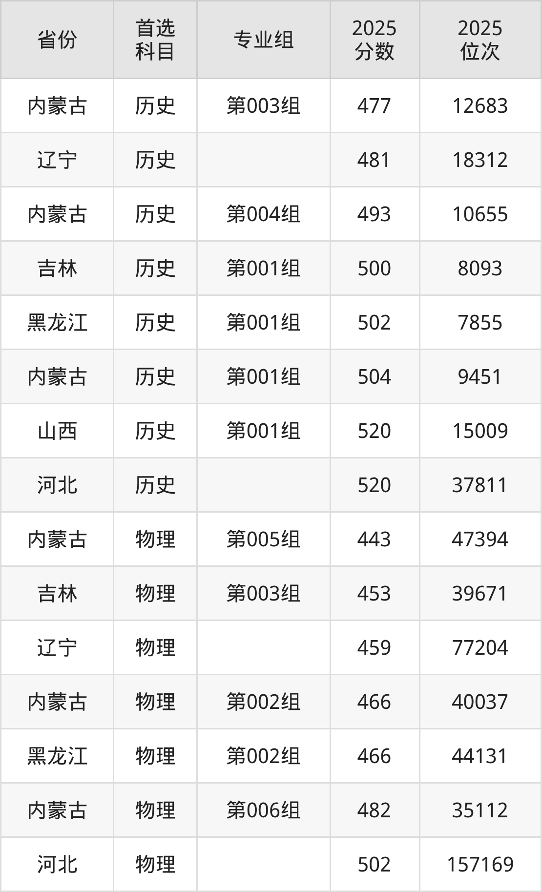 历史类最低分对应地区为内蒙古(第003组),录取位次为12683,超本科线59分;最高分对应地区为河北,录取位次为37811,超本科线43分。
