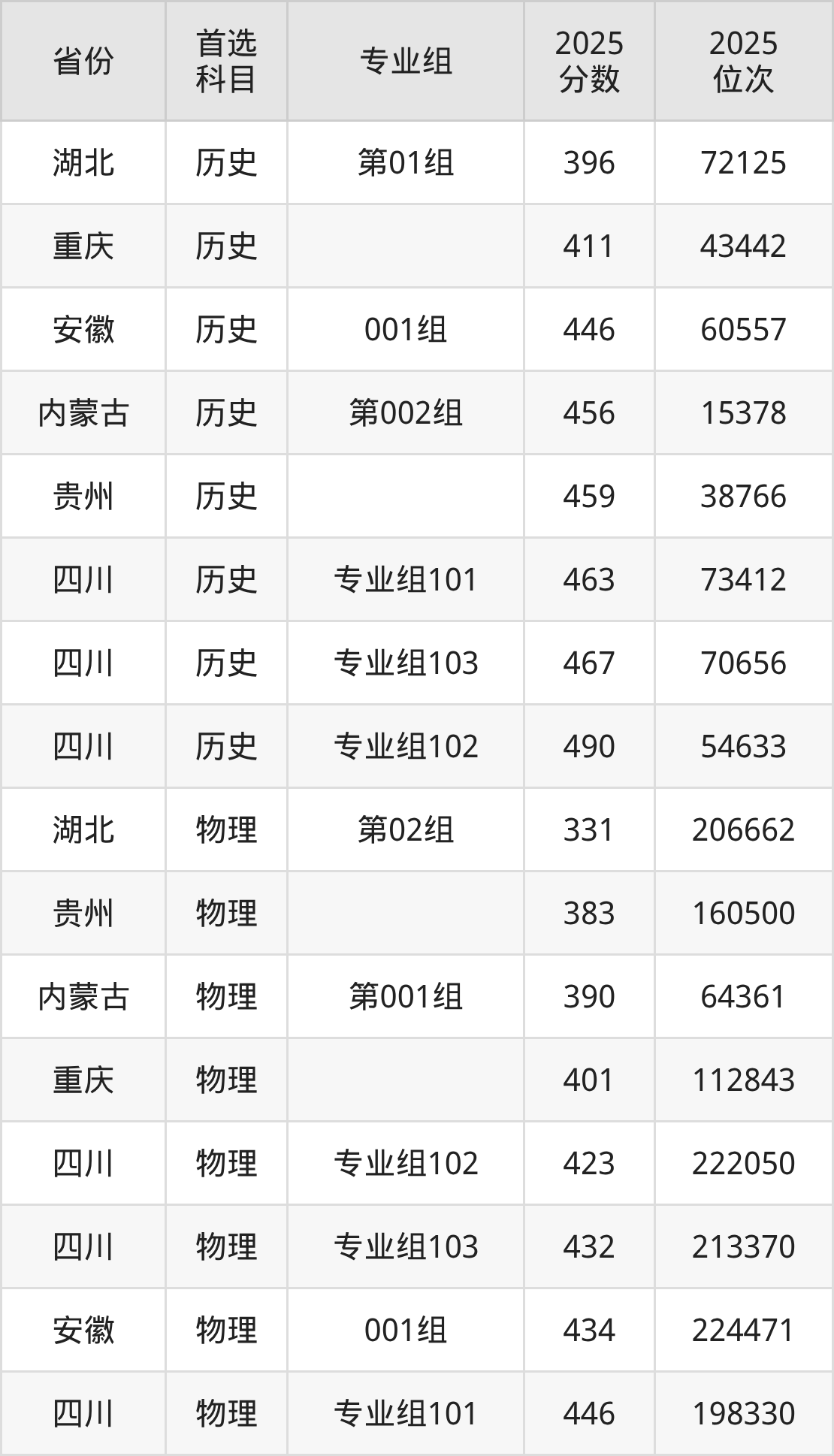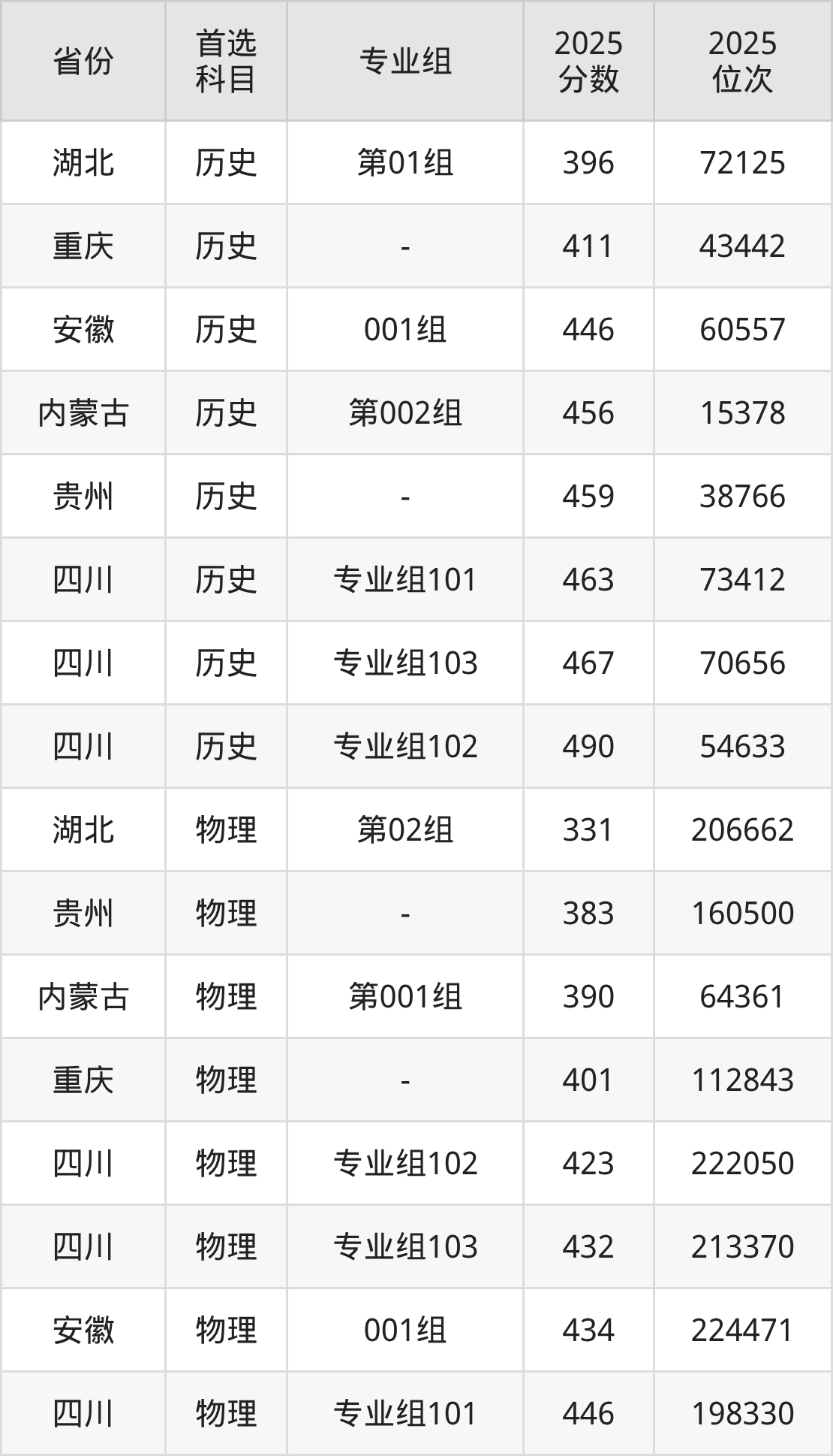 历史类最低分对应地区为湖北(第01组),录取位次为72125,超专科线196分;最高分对应地区为四川(专业组102),录取位次为54633。