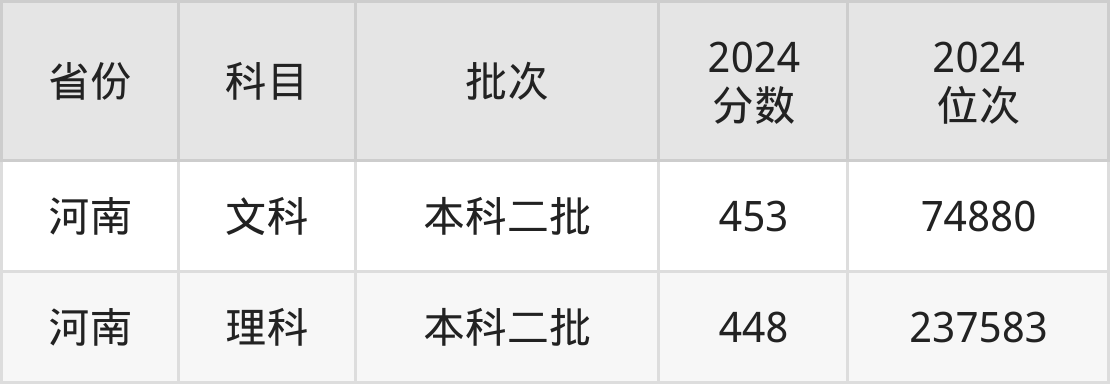 理科最低分对应地区为河南,录取位次为237583,超二本线52分。