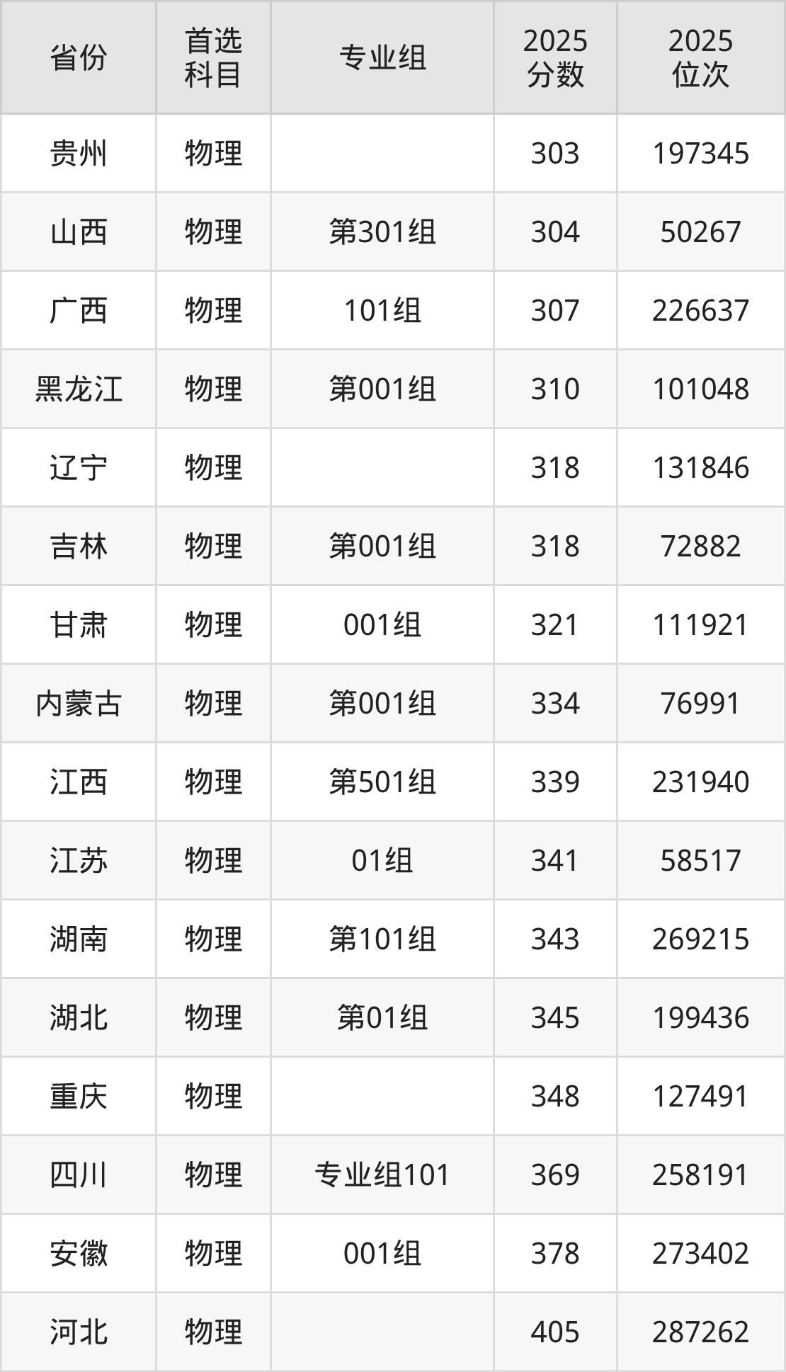 物理类最低分对应地区为贵州,录取位次为197345,超专科线123分;最高分对应地区为河北,录取位次为287262,超专科线205分。