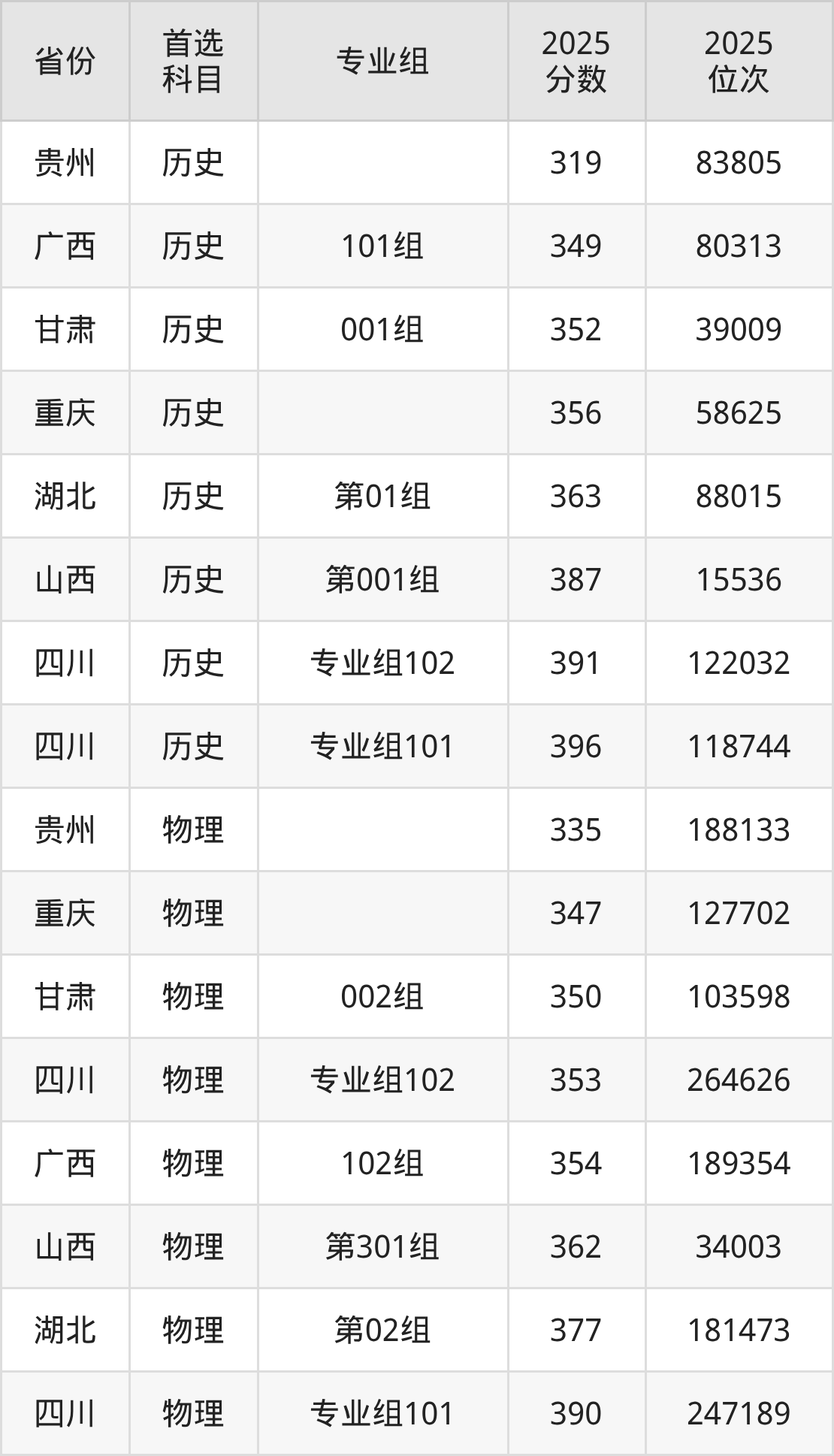物理类最低分对应地区为贵州,录取位次为188133,超专科线155分;最高分对应地区为四川(专业组101),录取位次为247189。