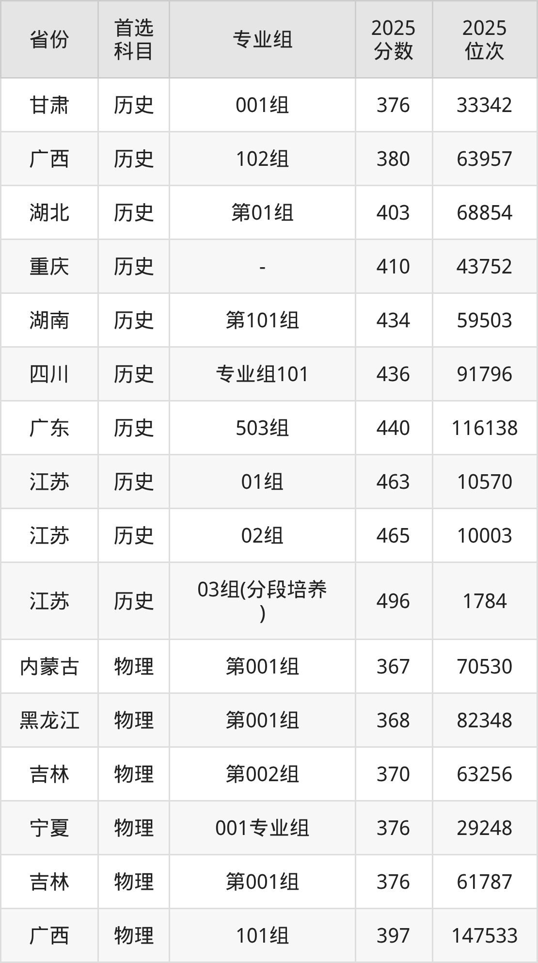 历史类最低分对应地区为甘肃(001组),录取位次为33342,超专科线216分;最高分对应地区为江苏(03组(分段培养)),录取位次为1784,超专科线276分。
