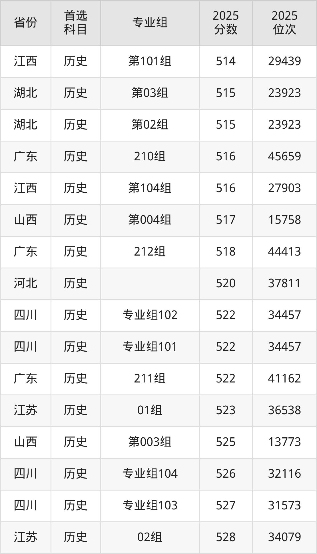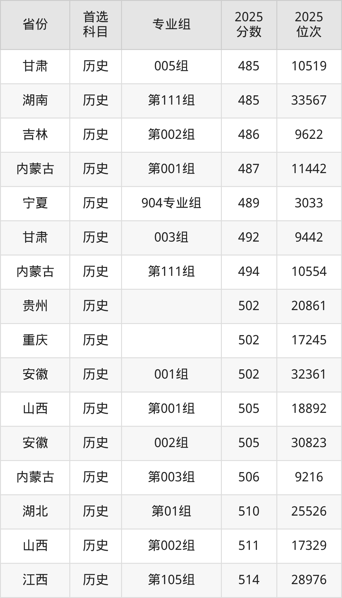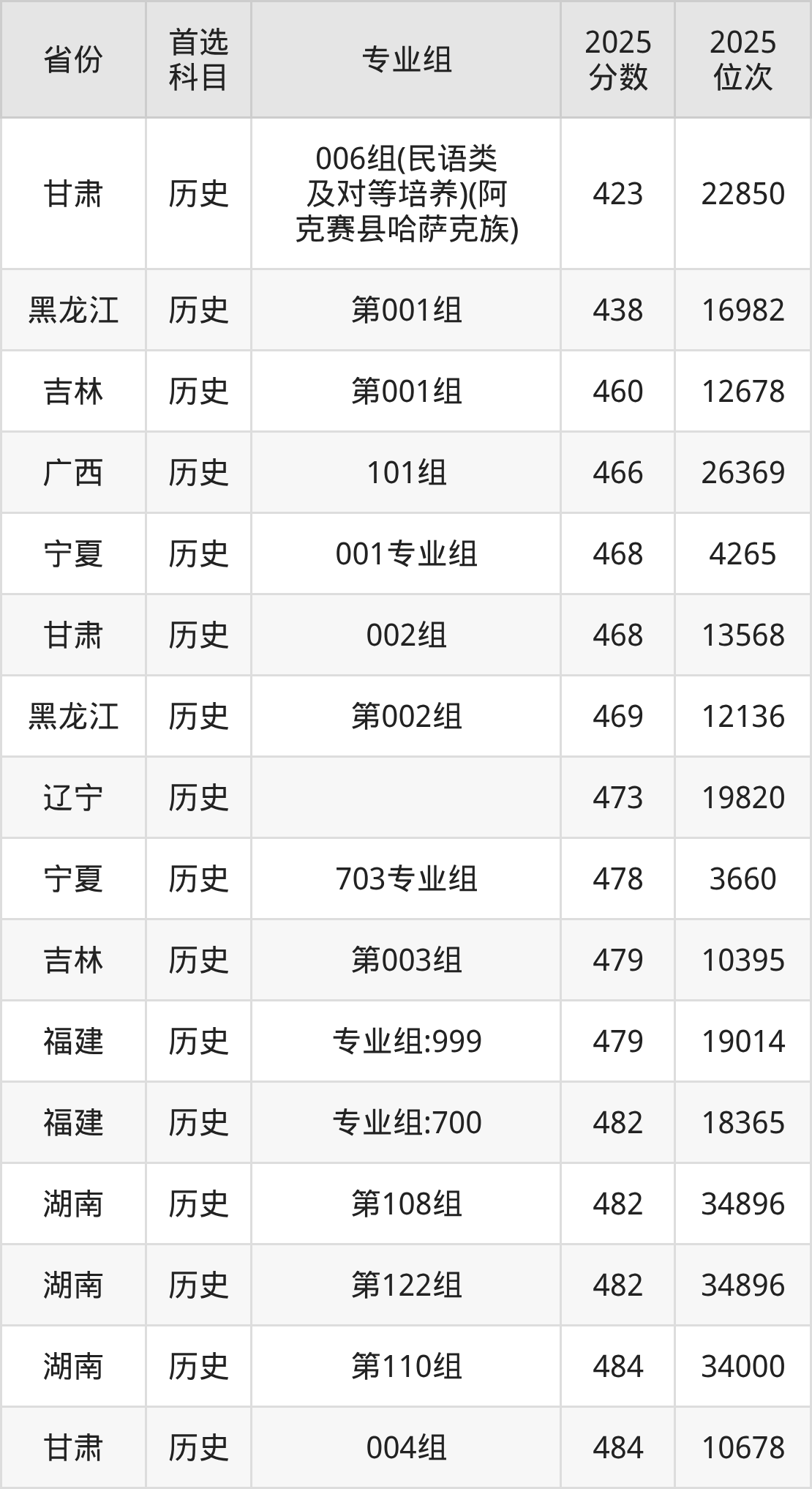 历史类最低分对应地区为甘肃(006组(民语类及对等培养)(阿克赛县哈萨克族)),录取位次为22850,超本科线11分;最高分对应地区为江苏(02组),录取位次为34079,超本科线46分。