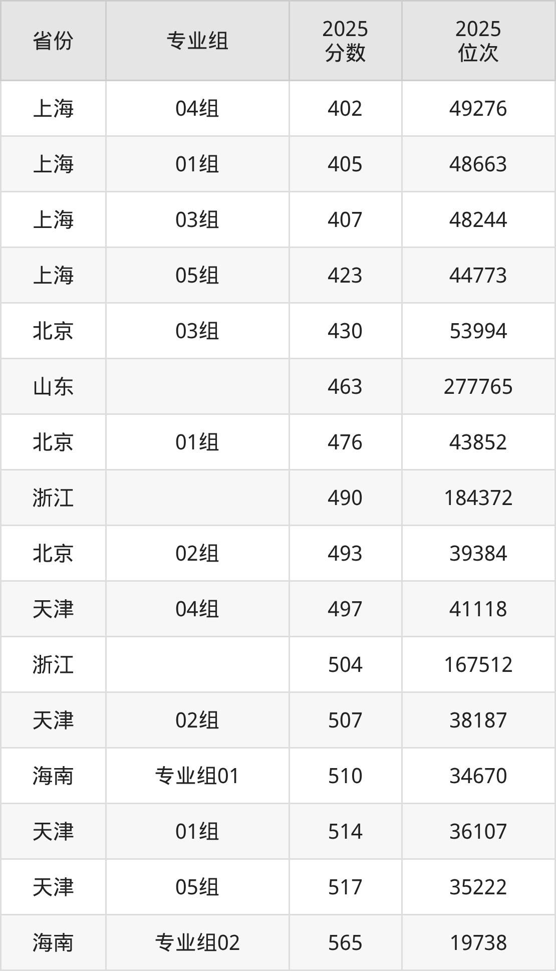 最低分对应地区为上海(04组),录取位次为49276;最高分对应地区为海南(专业组02),录取位次为19738,超本科线85分。