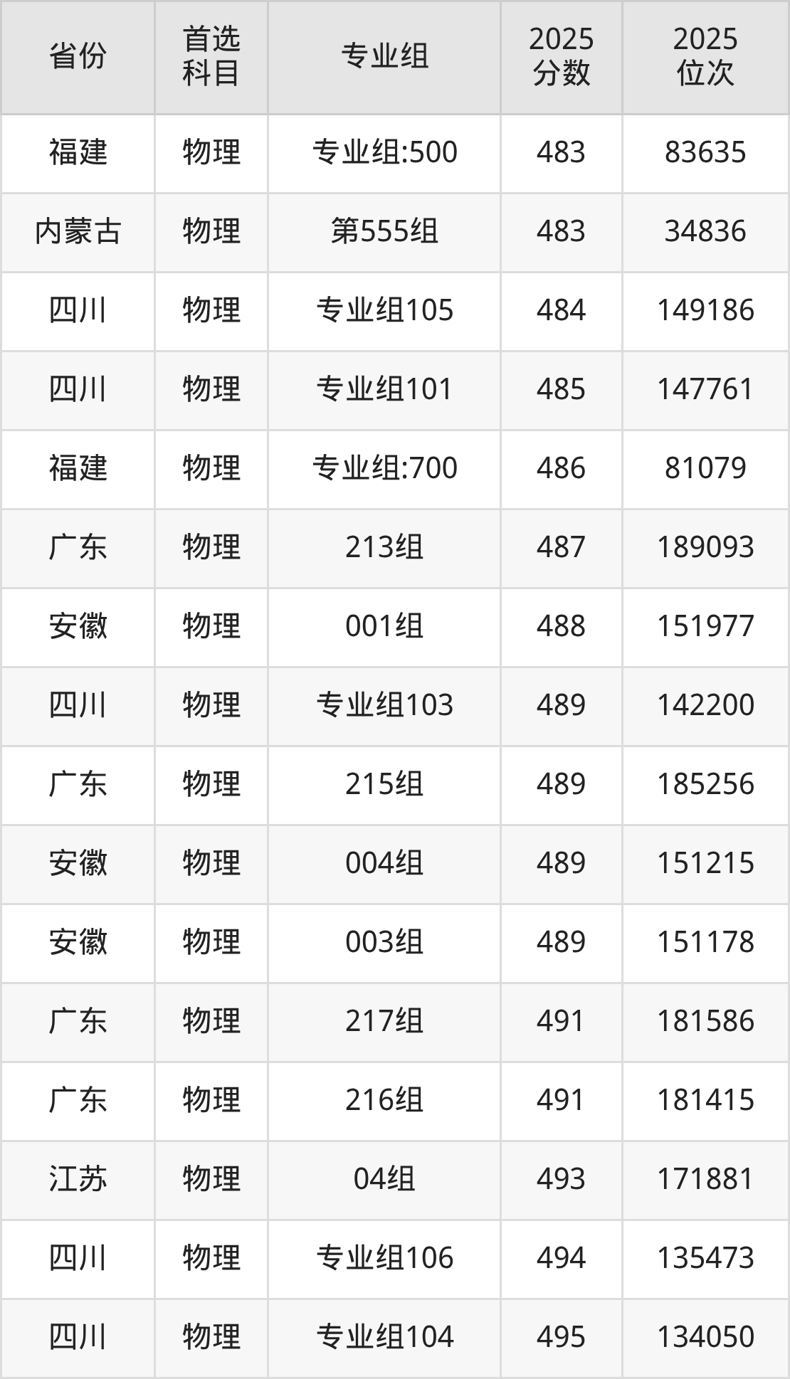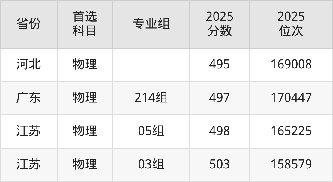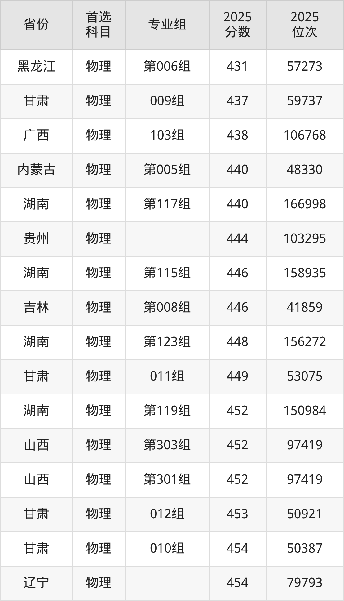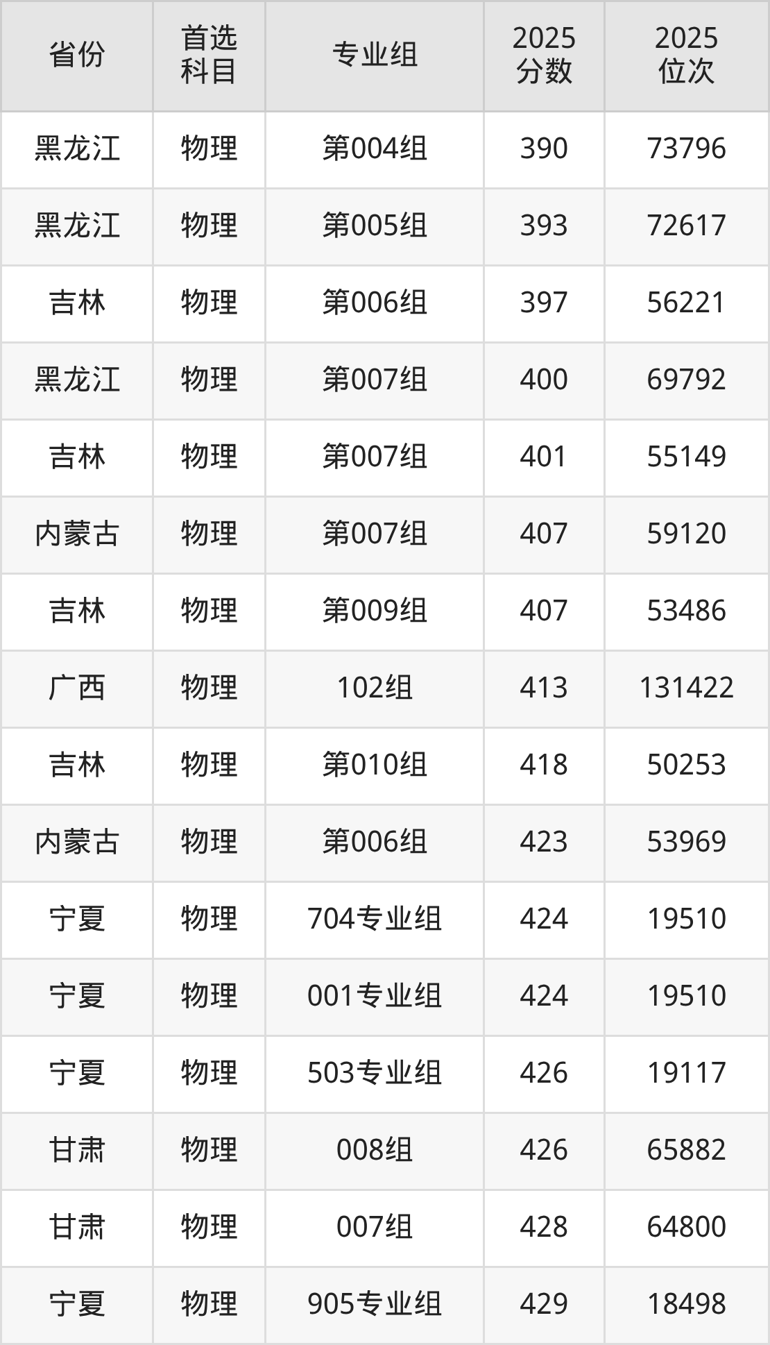 物理类最低分对应地区为黑龙江(第004组),录取位次为73796;最高分对应地区为江苏(03组),录取位次为158579。
