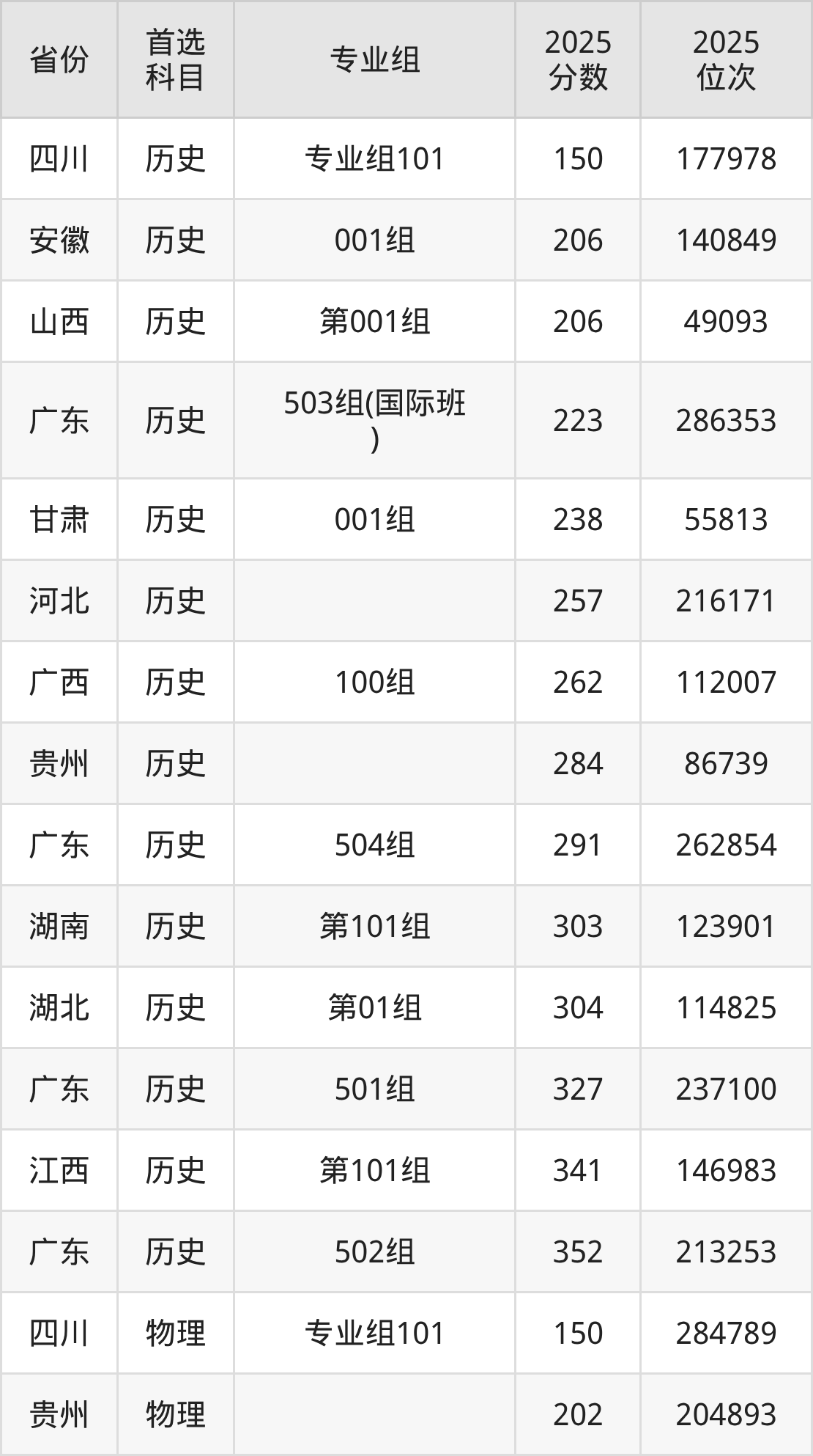 历史类最低分对应地区为四川(专业组101),录取位次为177978;最高分对应地区为广东(502组),录取位次为213253,超专科线137分。
