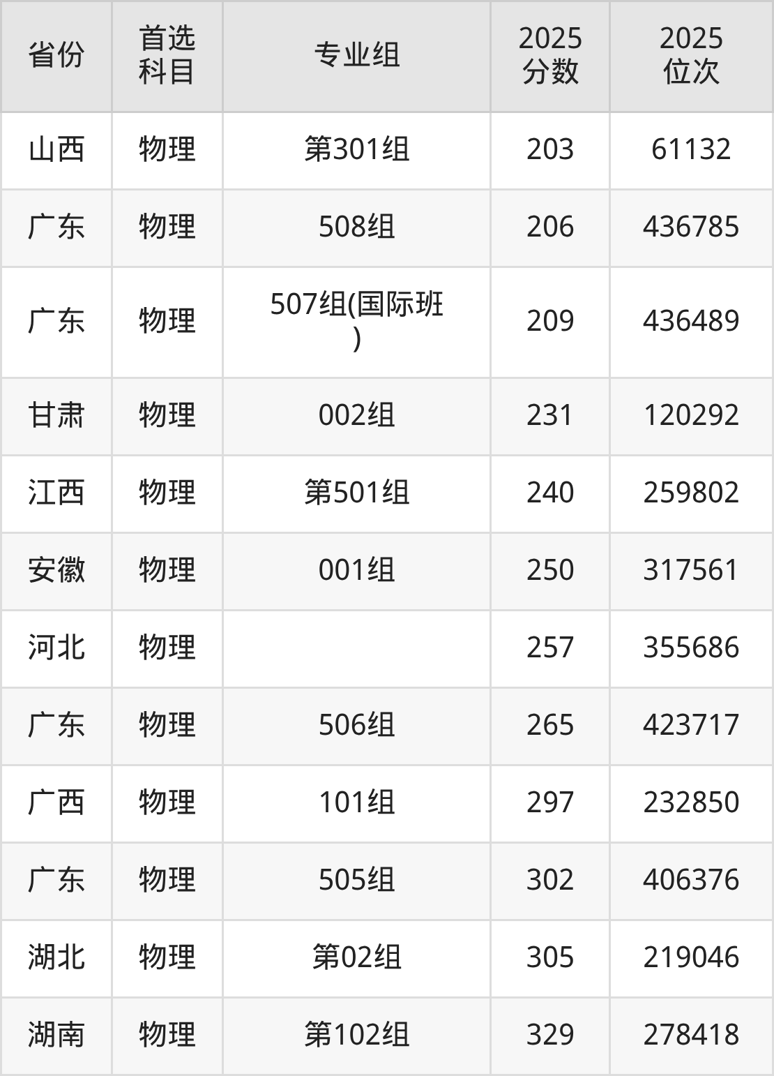 物理类最低分对应地区为四川(专业组101),录取位次为284789;最高分对应地区为湖南(第102组),录取位次为278418,超专科线129分。