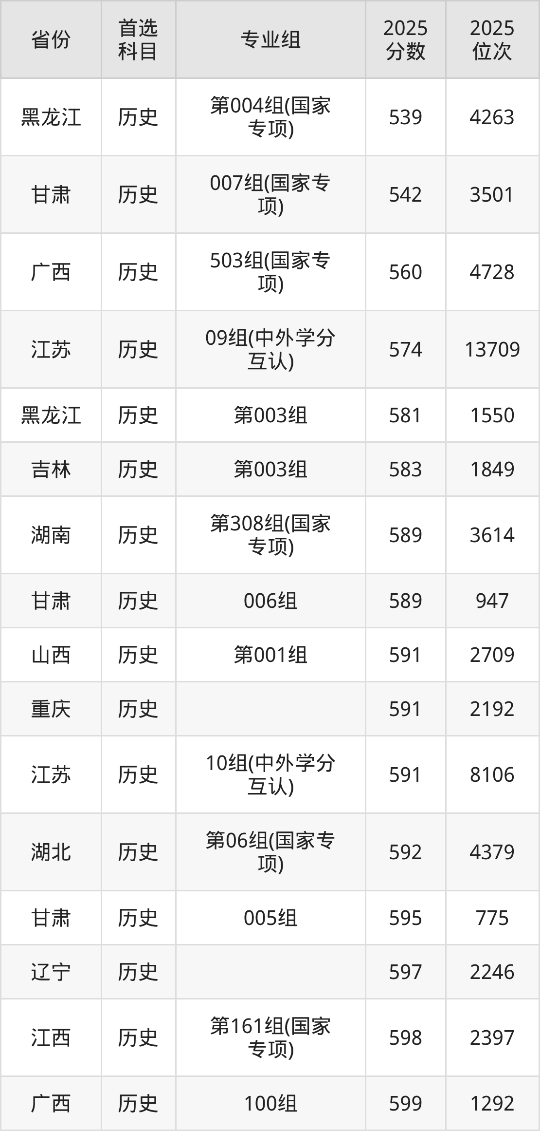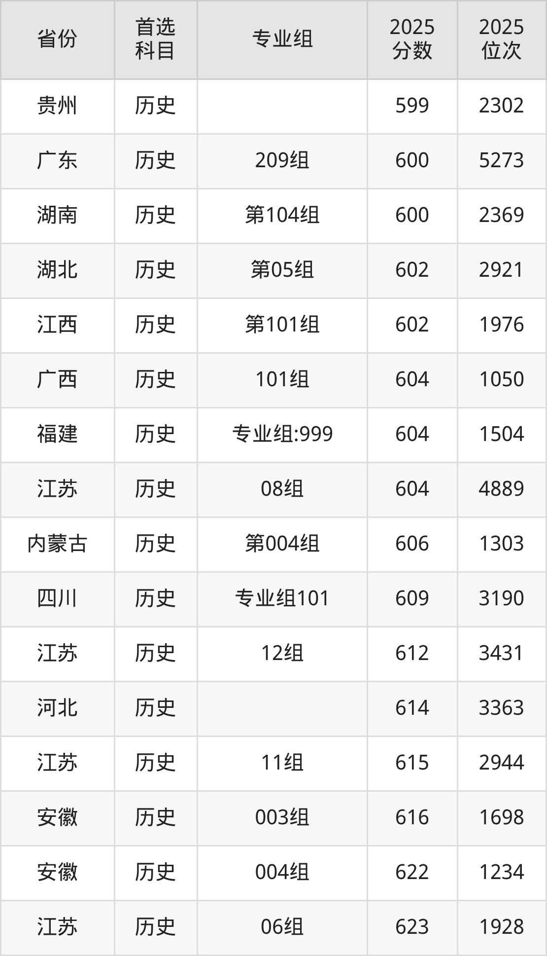 历史类:05组629分、1337名,06组623分、1928名,07组624分、1795名,08组604分、4889名,09组(中外学分互认)574分、13709名,10组(中外学分互认)591分、8106名,11组615分、2944名,12组612分、3431名;