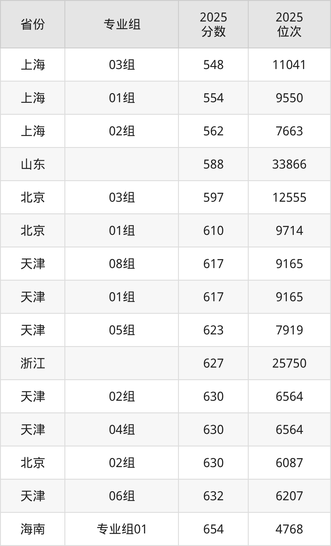 最低分对应地区为上海(03组),录取位次为11041,超本科线146分;最高分对应地区为海南(专业组01),录取位次为4768,超本科线174分。