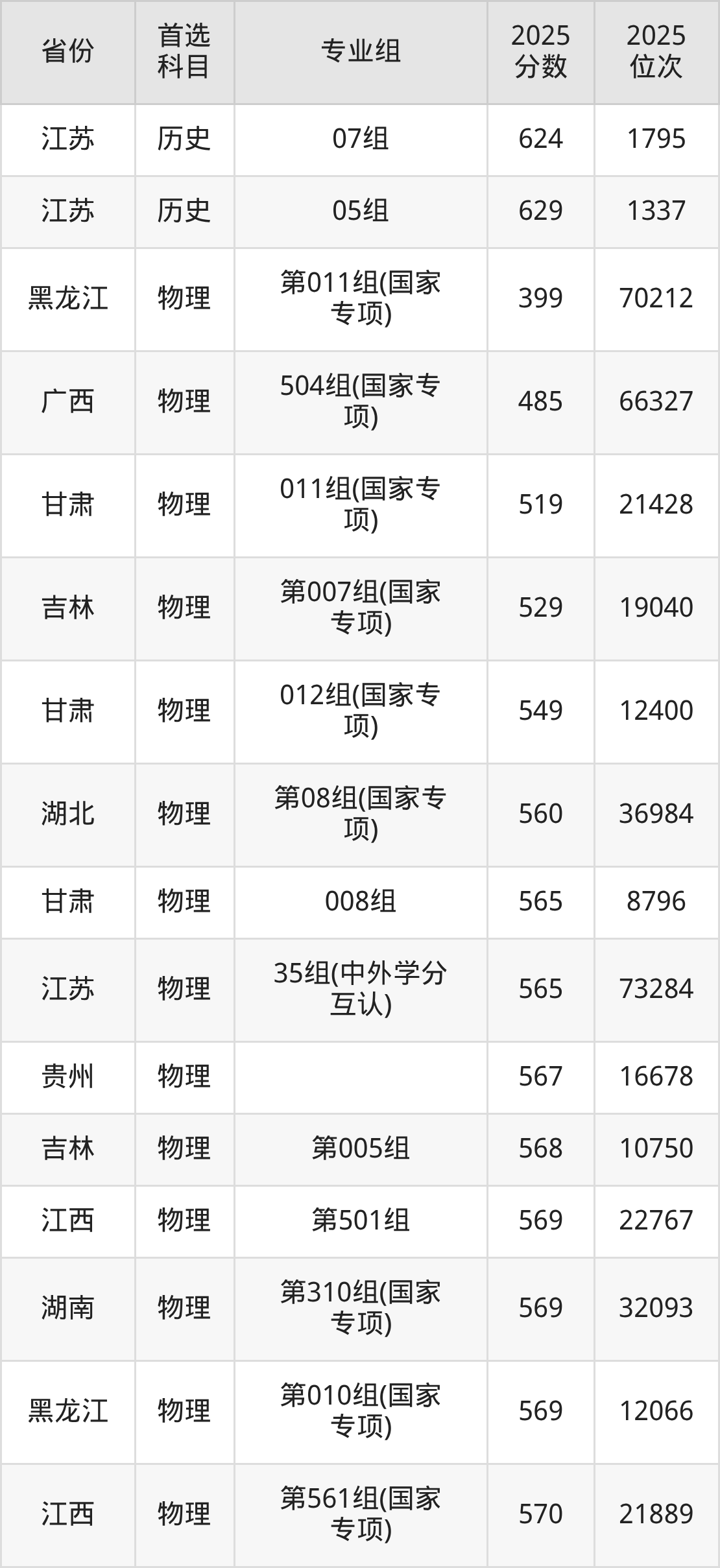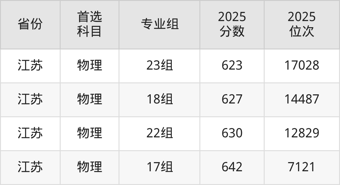 物理类:16组592分、36503名,17组(高校中外联合培养)581分、46288名,18组(高校中外联合培养)582分、45390名,19组643分、6605名,20组629分、12126名,21组632分、10759名,22组615分、19694名,23组602分、28486名,24组(中外合作)593分、35657名,25组(高校中外联合培养)600分、29983名,26组619分、17343名;