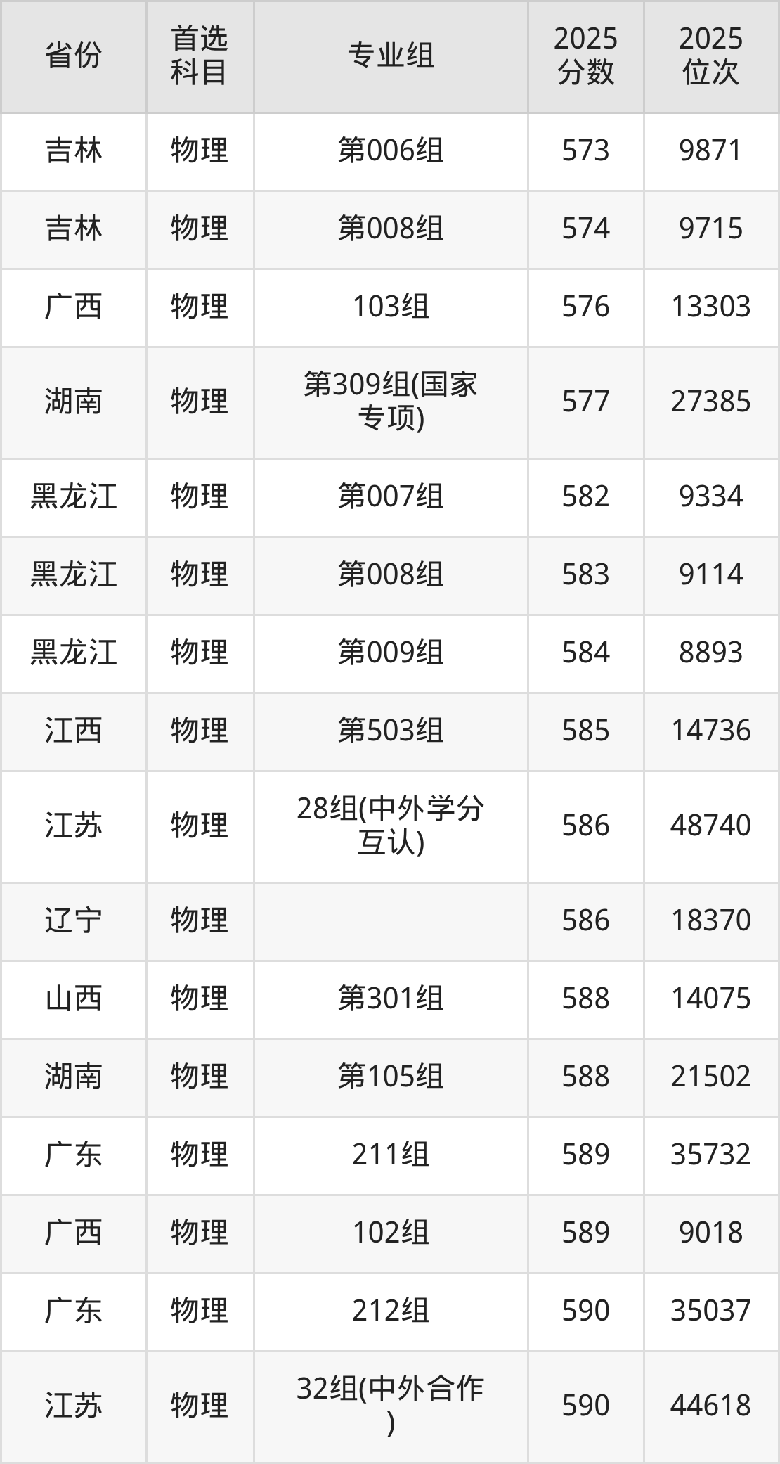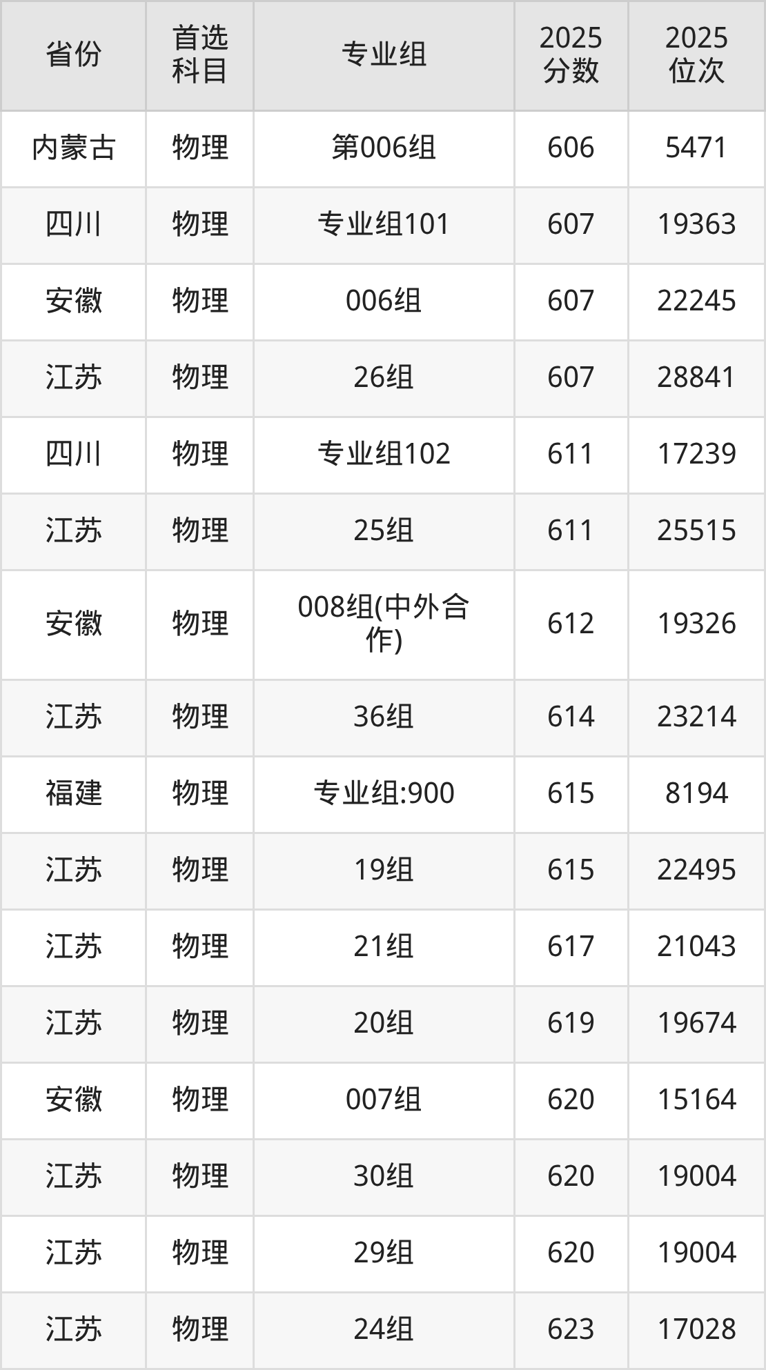 物理类:17组642分、7121名,18组627分、14487名,19组615分、22495名,20组619分、19674名,21组617分、21043名,22组630分、12829名,23组623分、17028名,24组623分、17028名,25组611分、25515名,26组607分、28841名,27组(中外合作)594分、40639名,28组(中外学分互认)586分、48740名,29组620分、19004名,30组620分、19004名,31组604分、31362名,32组(中外合作)590分、44618名,33组(中外合作)604分、31362名,34组(中外学分互认)601分、33985名,35组(中外学分互认)565分、73284名,36组614分、23214名;