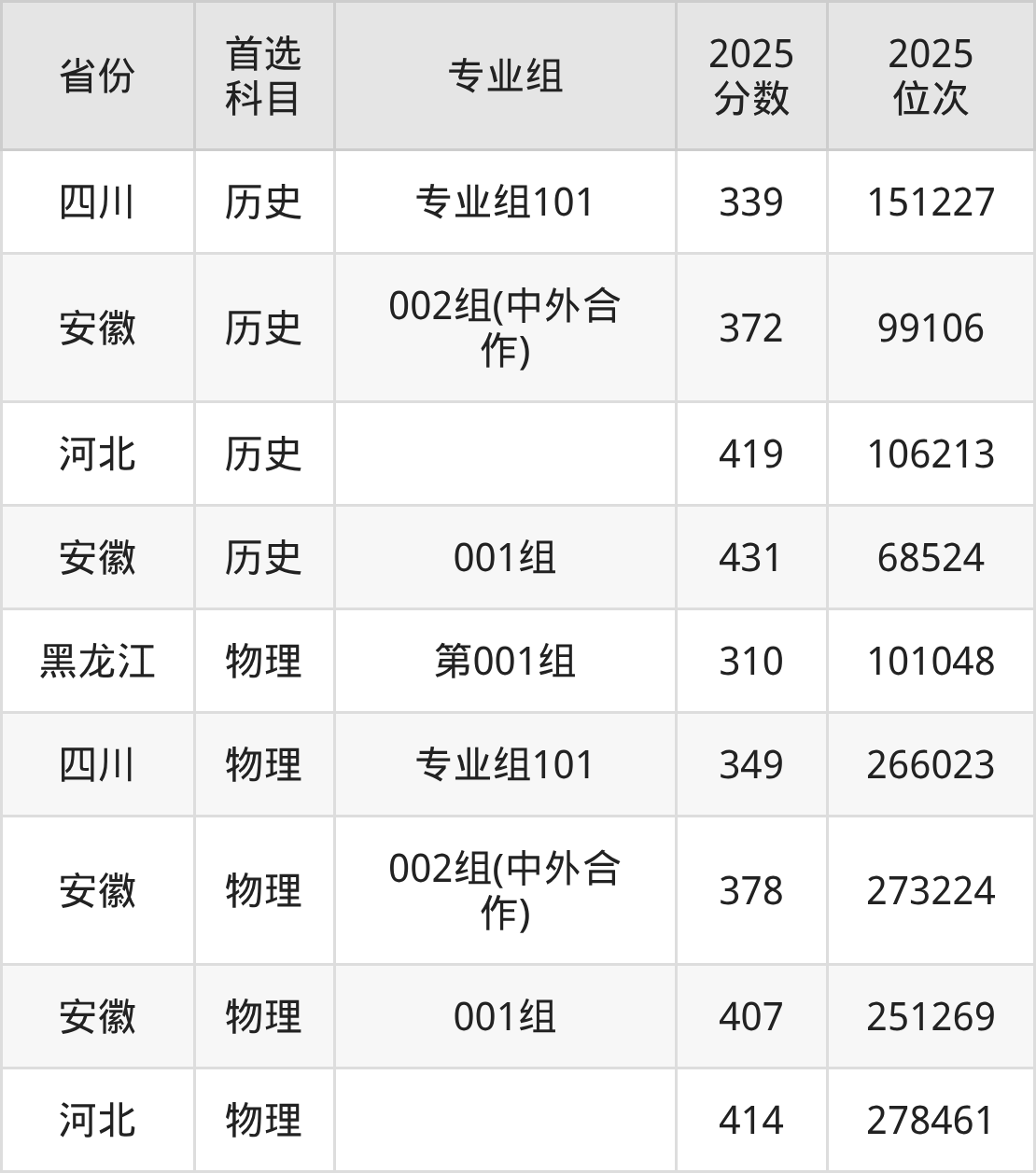 物理类:001组361分、273478名,002组(中外合作)337分、285410名;