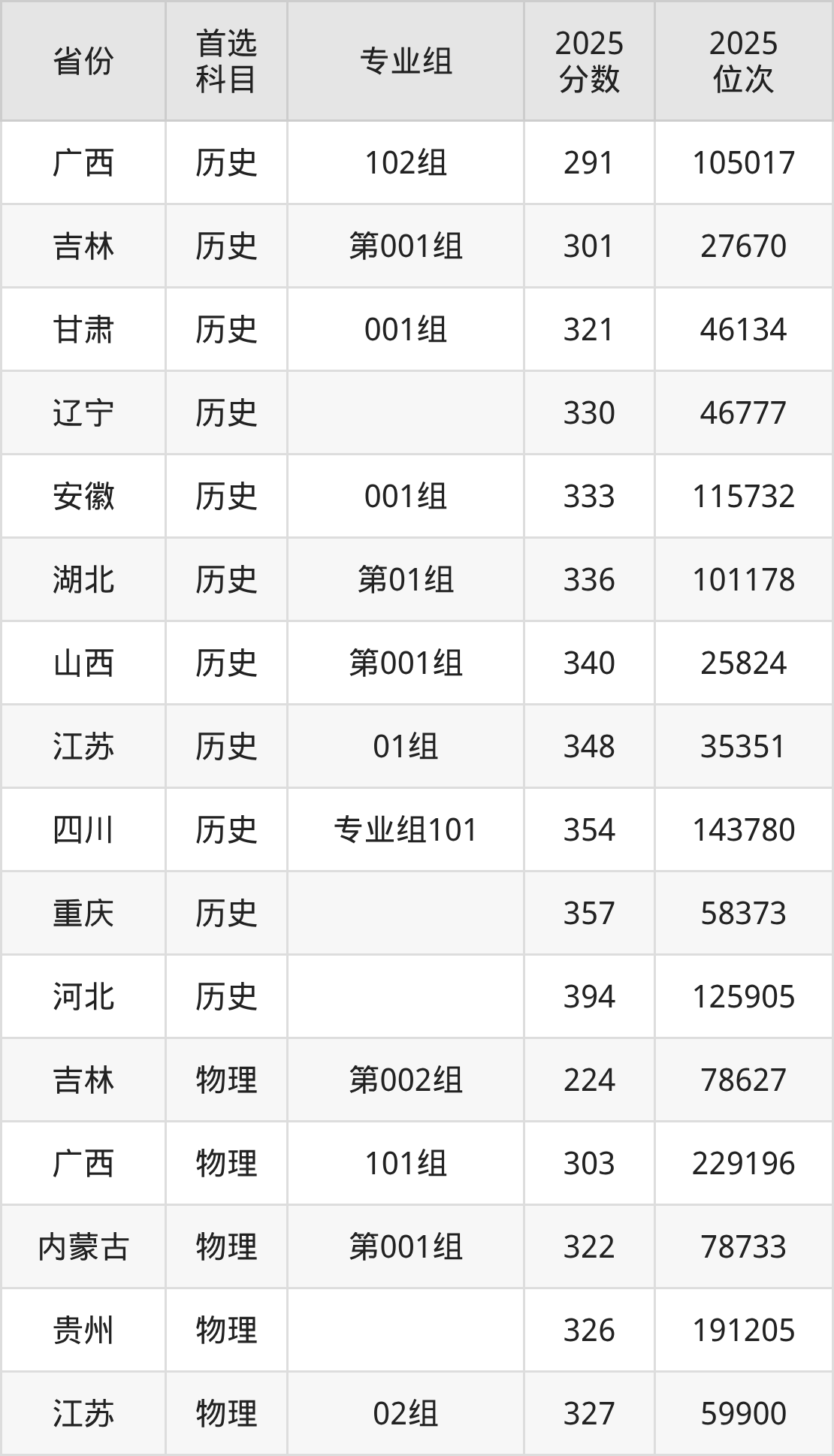 历史类最低分对应地区为广西(102组),录取位次为105017,超专科线91分;最高分对应地区为河北,录取位次为125905,超专科线194分。