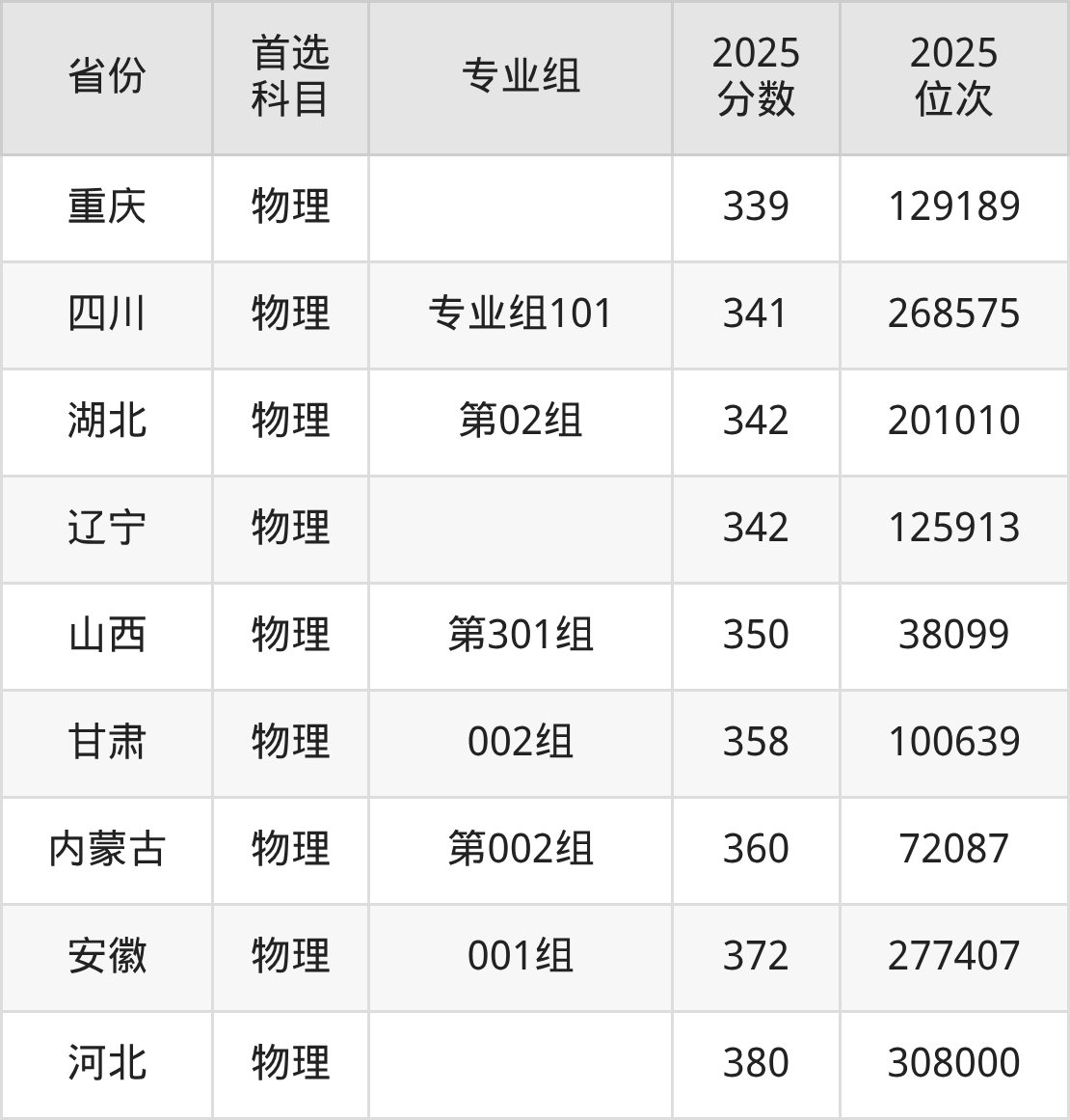 物理类最低分对应地区为吉林(第002组),录取位次为78627,超专科线64分;最高分对应地区为河北,录取位次为308000。
