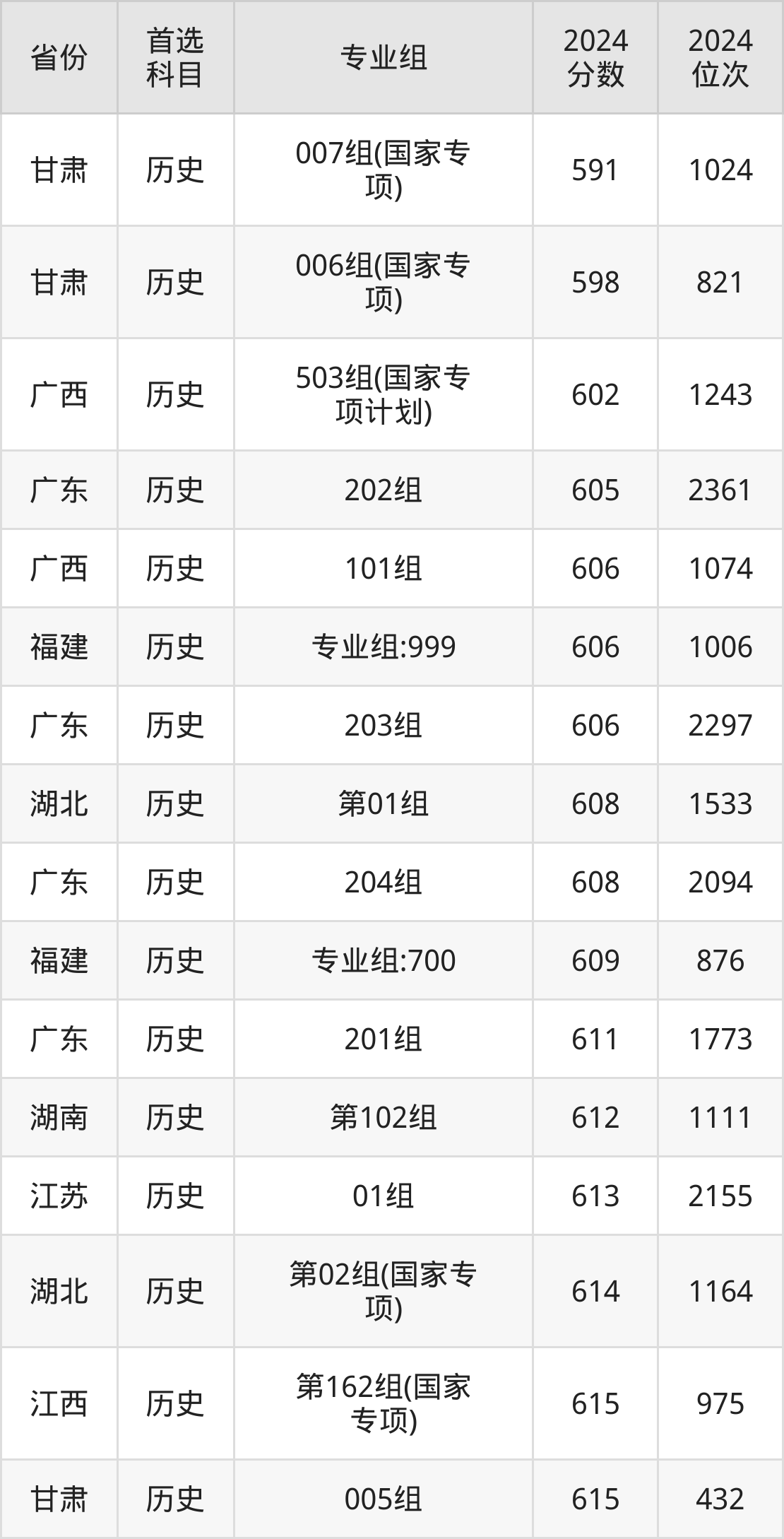 历史类最低分对应地区为甘肃(007组(国家专项)),录取位次为1024,超本科线170分;最高分对应地区为湖南(第101组),录取位次为262,超本科线197分。