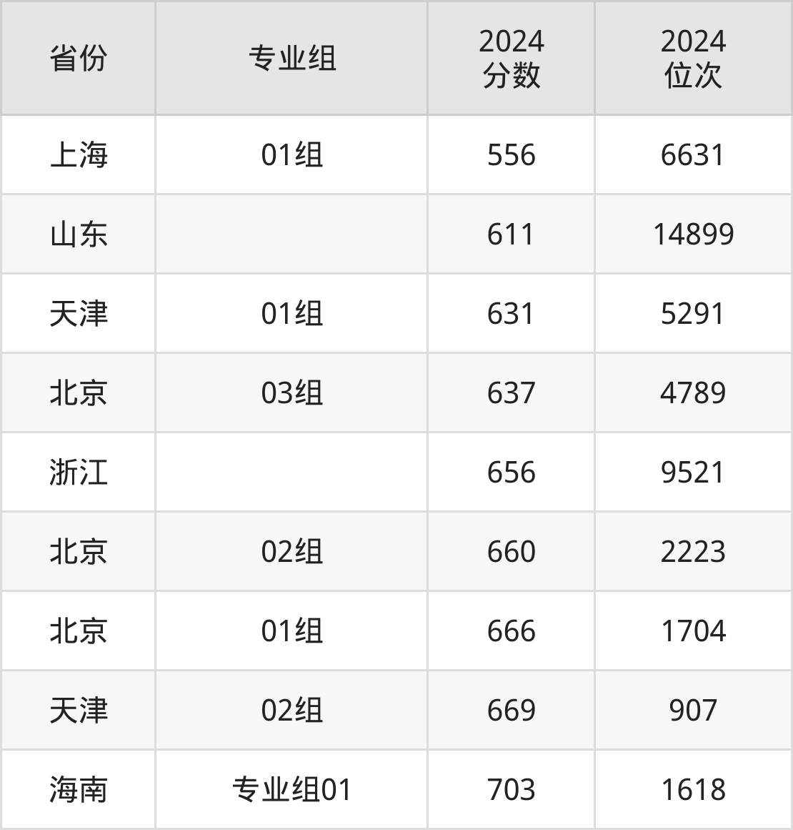 最低分对应地区为上海(01组),录取位次为6631,超本科线153分;最高分对应地区为海南(专业组01),录取位次为1618,超本科线220分。