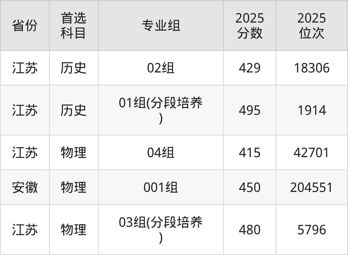 物理类最低分对应地区为江苏(04组),录取位次为42701,超专科线195分;最高分对应地区为江苏(03组(分段培养)),录取位次为5796。