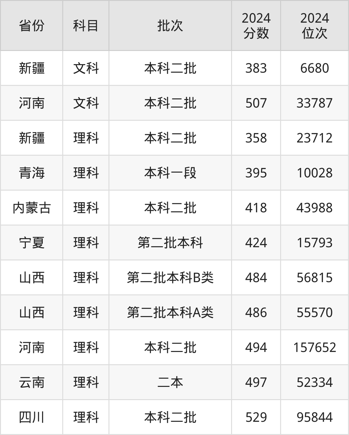 理科最低分对应地区为新疆,录取位次为23712,超二本线96分;最高分对应地区为四川,录取位次为95844,超二本线70分。