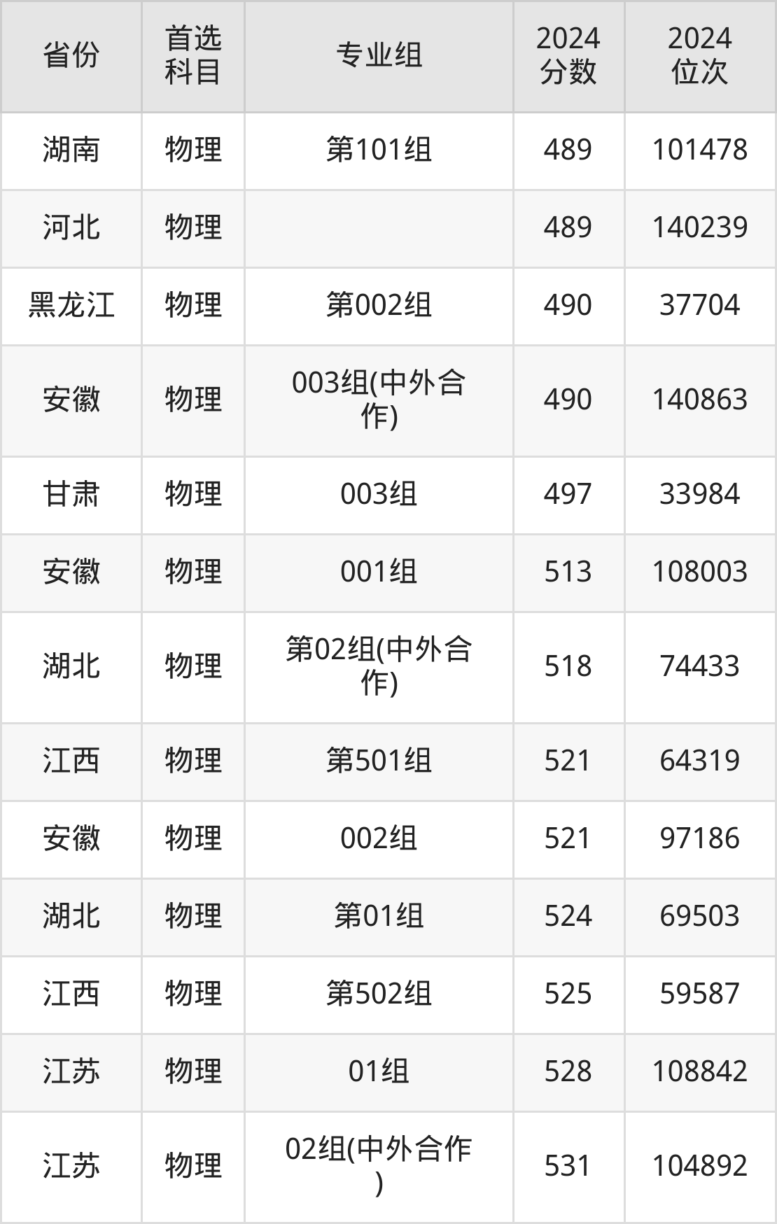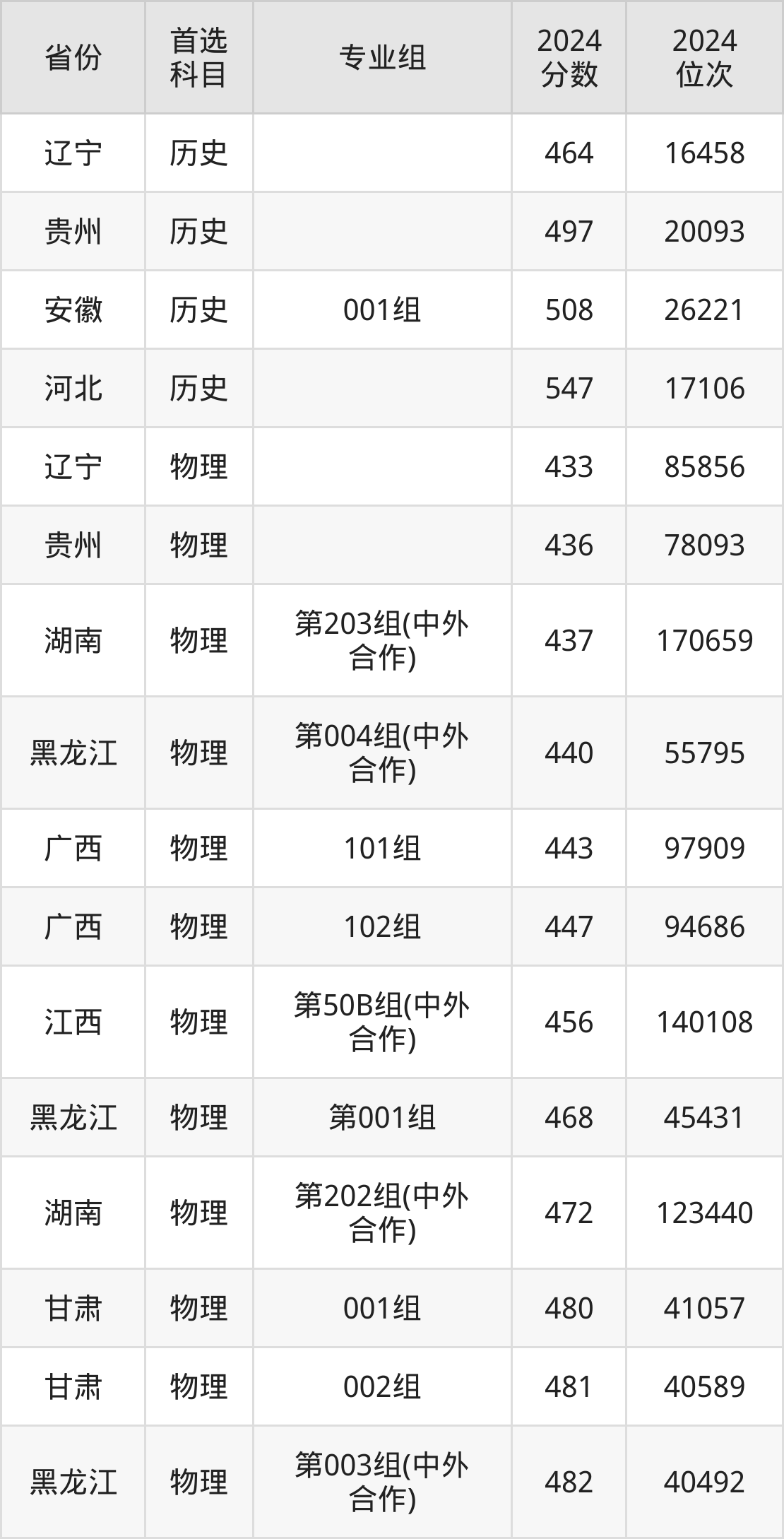 物理类最低分对应地区为辽宁,录取位次为85856,超本科线65分;最高分对应地区为江苏(02组(中外合作)),录取位次为104892,超本科线69分。